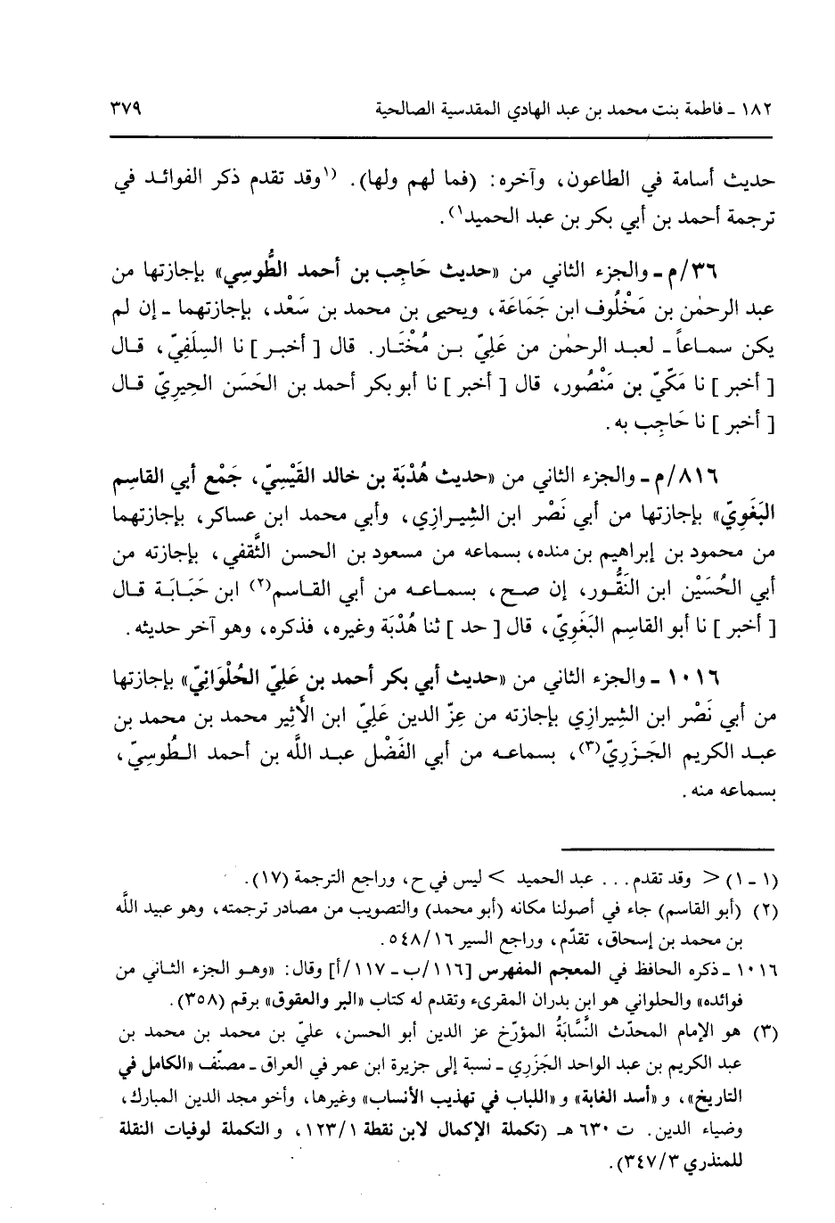 حديث أسامة في الطاعون، وآخره (فما لهم ولها). وقد تقدم ذكر الفوائد في ترجمة أحمد بن أبي بكر بن عبد الحميد ترجمة أحمد بن أبي بكر بن عبد الحميد. 36/م- والجزء الثاني من "حديث حاجب بن أحمد الطوسي" بإجازتها من عبد الرحمن بن مخلوف ابن جماعة ويحيى بن محمد بن سعد بإجازتهما -إن لم يكن سماعاً- لعبد الرحمن من علي بن مُختار قال [أخبر] نا السلفي قال [أخبر] نا مكي بن منصور قال [أخبر] نا أبو بكر أحمد بن الحسن الحيري قال [أخبر] نا حاجب به. 816/م- والجزء الثاني من "حديث هُدبة بن خالد القيسي جمع أبي القاسم البغوي" بإجازتها من أبي نصر ابن الشيرازي وأبي محمد ابن عساكر بإجازتهما من محمود بن إبراهيم بن منده بسماعه من مسعود بن الحسن الثقفي بإجازته من أبي الحسين ابن النقور إن صح بسماعه من أبي القاسم ابن حبابة قال [أخبر] نا أبو القاسم البغوي قال [حد] ثنا هُدبة وغيره فذكره وهو آخر حديثه. 1016 - والجزء الثاني من "حديث أبي بكر أحمد بن علي الحُلواني" بإجازتها من أبي نصر ابن الشيرازي بإجازته من عز الدين علي ابن الأثير محمد بن محمد بن عبد الكريم الجزري بسماعه من أبي الفضل عبد الله بن أحمد الطوسي بسماعه منه.