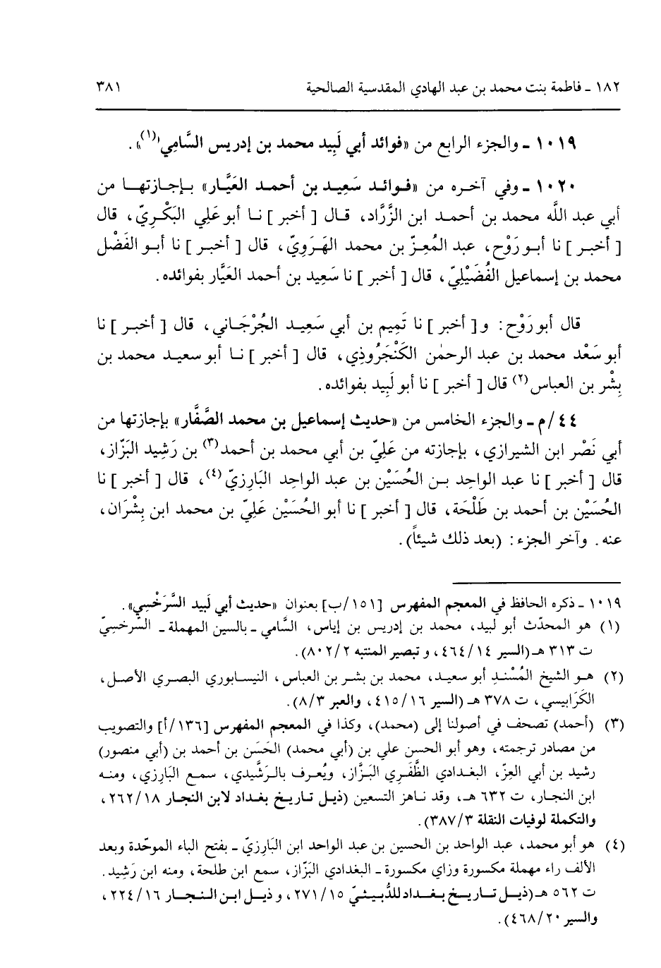 1019 - والجزء الرابع من "فوائد أبي لبيد محمد بن إدريس السامي" 1020 - وفي آخره من "فوائد سعيد بن أحمد العيار" بإجازتها من أبي عبد الله محمد بن أحمد ابن الزارد قال [أخبر] نا أبو علي البكري قال [أخبر] نا أبو روح عبد المعز بن محمد الهروي قال [أخبر] نا أبو الفضل محمد بن إسماعيل الفُضيلي قال [أخبر] نا سعيد بن أحمد العيار بفوائده. قال أبو روح: و [أخبر] نا تميم بن أبي سعيد الجرجاني قال [أخبر] نا أبو سعد محمد بن عبد الرحمن الكنجروذي قال [أخبر] نا أبو سعيد محمد بن بشر بن العباس قال [أخبر] نا أبو لبيد بفوائده. 44/م- والجزء الخامس من "حديث إسماعيل بن محمد الصفار" بإجازتها من أبي نصر ابن الشيرازي بإجازته من فلي بن أبي محمد بن أحمد بن رشيد البزاز قال [أخبر] نا عبد الواحد بن الحسين بن عبد الواحد البارزي قال [أخبر] نا الحسين بن أحمد بن طلحة قال [أخبر] نا أبو الحسين علي بن محمد ابن بشران عنه. وآخر الجزء: (بعد ذلك شيئاً).