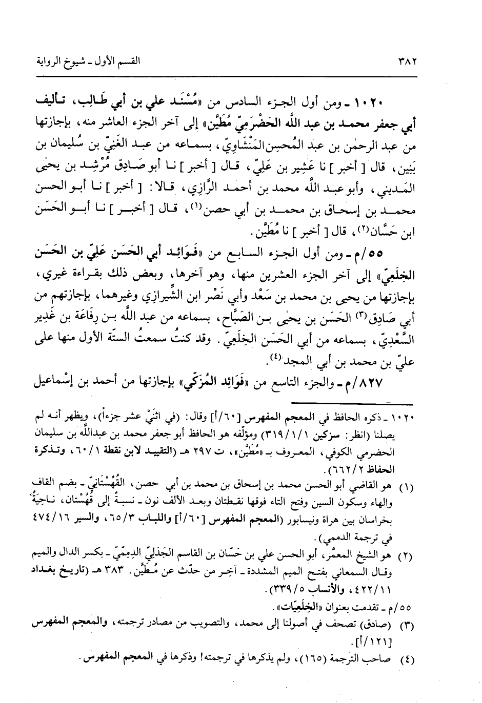 1020 - ومن أول الجزء السادس من "مسند علي بن أبي طالب تأليف أبي جعفر محمد بن عبد الله الحضرمي مطين" إلى آخر الجزء العاشر منه بإجازتها من عبد الرحمن بن عبد المحسن المنشاوي بسماعه من عبد الغني بن سليمان بن ينبن قال [أخبر] نا عشير بن علي قال [أخبر] نا أبو صادق مرشد بن يحيى المديني وأبو عبد الله محمد بن أحمد الرازي قالا [أخبر] نا أبو الحسن محمد بن إسحاق بن محمد بن أبي حصن قال [أخبر] نا أبو الحسن ابن حسان قال [أخبر] نا مطين. 55/م- ومن أول الجزء السابع من "فوائد أبي الحسن علي بن الحسن الخلعي" إلى آخر الجزء العشرين منها وهو آخرها وبعض ذلك بقراءة غيري بإجازتها من يحيى بن محمد بن سعد وأبي نصر ابن الشيرازي وغيرهما بإجازتهم من أبي صادق الحسن بن يحيى بن الصباح بسماعه من عبد الله بن رفاعة بن غدير السعدي بسماعه من أبي الحسن الخلعي. وقد كنت سمعت الستة الأول منها على علي بن محمد بن أبي المجد. 827/م- والجزء التاسع من "فوائد المزكي" بإجازتها من أحمد بن إسماعيل
