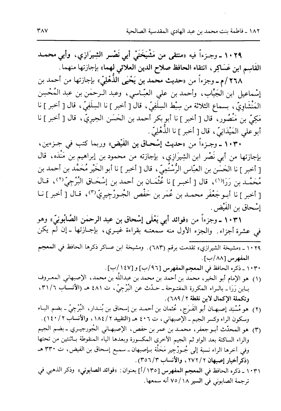 1029 - وجزءاً فيه "منتقى من مشيختي أبي نصر الشيرازي وأبي محمد القاسم ابن عساكر انتقاء الحافظ صلاح الدين العلائي لهما" بإجازتها منهما. 268/م- وجزءاً من "حديث محمد بن يحيى الذُهلي" بإجازتها من أحمد بن إسماعيل ابن الجباب وأحمد بن علي العباسي وعبد الرحمن بن عبد المحسن المنشاوي بسماعه الثلاثة من سبط السلفي قال [أخبر] نا السلفي قال [أخبر] نا مكي بن منصور قال [أخبر] نا أبو بكر أحمد بن الحسن الحيري قال [أخبر] نا أبو علي الميداني قال [أخبر] نا الدهلي. 1030 - وجزءاً من "حديث إسحاق ابن الفيض" وربما كتب في جزءين بإجازتها من أبي نصر ابن الشيرازي بإجازته من محمود بن إبراهيم بن منده قال [أخبر] نا الحسن ابن العباس الرُستُمي قال [أخبر] نا أبو الخير محمد بن أحمد بن محمد بن ررا قال [أخبر] نا عُثمان بن أحمد بن إسحاق البُرجي قال [أخبر] نا أبو جعفر محمد بن حفص الجورجيري قال [أخبر] نا إسحاق بن الفيض. 1031 - وجزءاً من "فوائد أبي يعلي إسحاق بن عبد الرحمن الصابوني" وهو في عشرة أجزاء. والجزء الأول منه سمعته بقراءة غيري بإجازتها -إن لم يكن