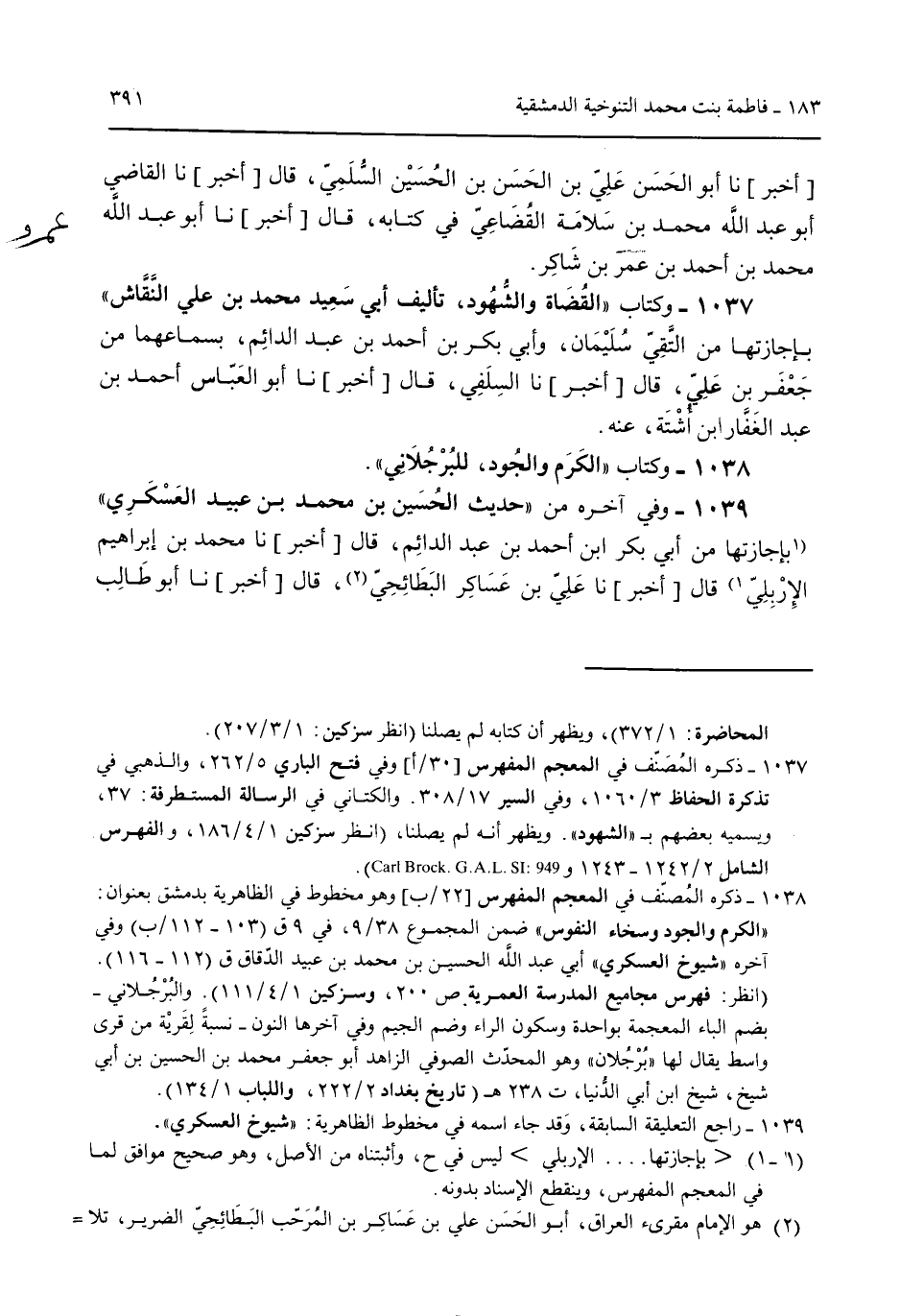 [أخبر] نا أبو الحسن علي بن الحسن بن الحسين السلمي قال [أخبر] نا القاضي أبو عبد الله محمد بن سلامة القُضاعي في كتابه قال [أخبر] نا أبو عبد الله محمد بن أحمد بن عمر بن شاكر. 1037 - وكتاب "القُضاة والشهود تأليف أبي سعيد محمد بن علي النقاش" بإجازتها من التقي سليمان وأبي بكر بن أحمد بن عبد الدائم بسماعهما من جعفر بن علي قال [أخبر] نا السلفي قال [أخبر] نا أبو العباس أحمد بن عبد الغفار ابن أشتة عنه. 1038 - وكتاب "الكرم والجود للبرجلاني". 1039 - وفي آخره من "حديث الحسين بن محمد بن عبيد العسكري" بإجازتها من أبي بكر ابن أحمد بن عبد الدائم قال [أخبر] نا محمد بن إبراهيم الإربلي قال [أخبر] نا علي بن عساكر البطائحي قال [أخبر] نا أبو طالب