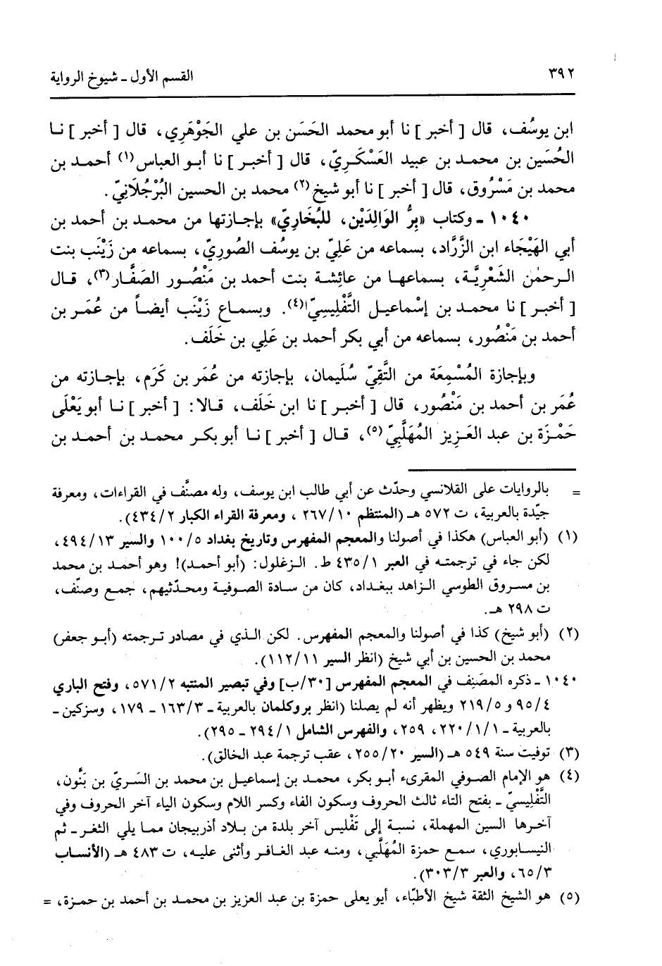 ابن يوسف قال [أخبر] نا أبو محمد الحسن بن علي الجوهري قال [أخبر] نا الحسين بن محمد بن عبيدد العسكري قال [أخبر] نا أبو العباس أحمد بن محمد بن مسروق قال [أخبر] نا أبو شيخ محمد بن الحسين البُرجلاني. 1040 - وكتاب "بر الوالدين للبخاري" بإجازتها من محمد بن أحمد بن أبي الهيجاء ابن الزارد بسماعه من علي بن يوسف الصوري بسماعه من زينب بنت الرحمن الشعرية بسماعها من عائشة بنت أحمد بن منصور الصفار قال [أخبر] نا محمد بن إسماعيل التفليسي وبسماع زينب أيضاً من عمر بن أحمد بن منصور بسماعه من أبي بكر أحمد بن علي بن خلف. وبإجازة المسمعة من التقي سليمان بإجازته من عمر بن كرم بإجازته من عمر بن أحمد بن منصور قال [أخبر] نا ابن خلف قالا: [أخبر] نا أيو يعلى حمزة بن عبد العزيز المُهبلي قال [أخبر] نا أبو بكر محمد بن أحمد بن