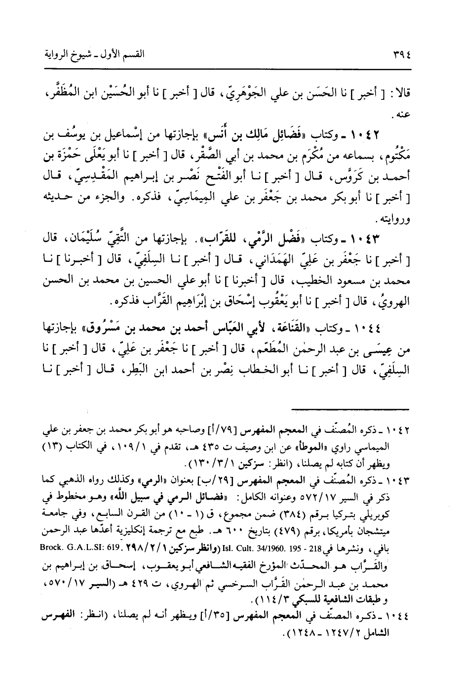 قالا: [أخبر] نا الحسن بن علي الجوهري قال [أخبر] نا أبو الحسين ابن المُظفر عنه. 1042 - وكتاب "فضائل مالك بن أنس" بإجازتها من إسماعيل بن يوسف بن مكتوم بسماعه من مكرم بن محمد بن أبي الصقر قال [أخبر] نا أيو يعلى حمزه بن أحمد بن كروس قال [أخبر] نا أبو الفتح نصر بن إبراهيم المقدسي قال [أخبر] نا أبو بكر محمد بن جعفر بن علي الميماسي فذكره. والجزء من حديث وروايته. 1043 - وكتاب "فضل الرمي للقراب". بإجازتها من التقي سليمان قال [أخبر] نا جعفر بن علي الهمداني قال [أخبر] نا السلفي قال [أخبر] نا محمد بن مسعود الخطيب قال [أخبر] نا أبو علي الحسين بن محمد بن الحسن الهروي قال [أخبر] نا أبو يعقوب إسحاق بن إبراهيم القراب فذكره. 1044 - وكتاب "القناعة لأبي العباس أحمد بن محمد بن مسروق" بإجازتها من عيسى بن عبد الرحمن المُطعم قال [أخبر] نا جعفر بن علي قال [أخبر] نا السلفي قال [أخبر] نا أبو الخطاب نصر بن أحمد بن البطر قال [أخبر] نا
