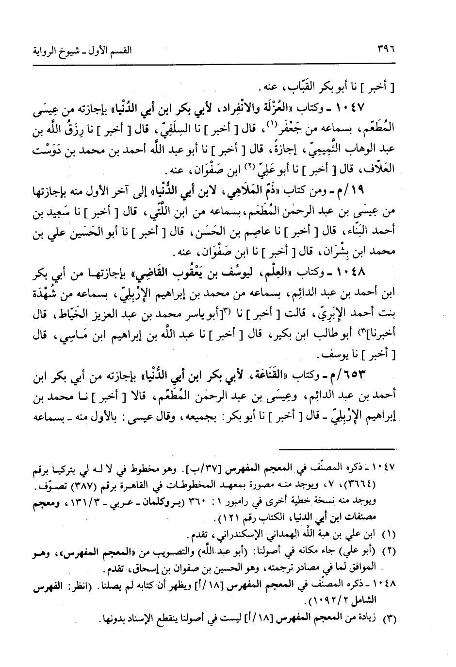 [أخبر] نا أبو بكر القباب عنه. 1047 - وكتاب "العُزلة والانفراد لأبي بكر ابن أبي الدنيا" بإجازته من عيسى المُطعم بسماعه من جعفر قال [أخبر] نا السلفي قال [أخبر] نا رزق الله بن عبد الوهاب التميمي إجازة قال [أخبر] نا أبو عبد الله أحمد بن محمد بن دوست العلاف قال [أخبر] نا أبو علي ابن صفوان عنه. 19/م- ومن كتاب "ذم الملاهي لابن أبي الدنيا" إلى آخر الأول منه بإجازتها من عيسى بن عبد الرحمن المُطعم بسماعه من ابن اللتي قال [أخبر] نا سعيد بن أحمد البناء قال [أخبر] نا عاصم بن الحسن قال [أخبر] نا أبو الحسين علي بن محمد ابن بشران قال [أخبر] نا ابن صفوان عنه. 1048 - وكتاب "العلم ليوسف بن يعقوب القاضي" بإجازتها من أبي بكر ابن أحمد بن عبد الدائم بسماعه من محمد بن إبراهيم الإربلي بسماعه من شهدة نت أحمد الإبري قالت [أخبر] نا أبو ياسر محمد بن عبد العزيز الخياط قال [أخبر] نا أبو طالب ابن بكير قال [أخبر] نا عبد الله بن إبراهيم ابن ماسي قال [أخبر] نا يوسف. 653/م- وكتاب "القناعة لأبي بكر ابن أبي الدنيا" بإجازته من أبي بكر ابن أحمد بن عبد الدائم وعيسى بن عبد الرحمن المُطعم قالا [أخبر] نا محمد بن إبراهيم الإربلي قال [أخبر] نا أبو بكر: بجميعه وقال عيسى: بالأول منه- بسماعه