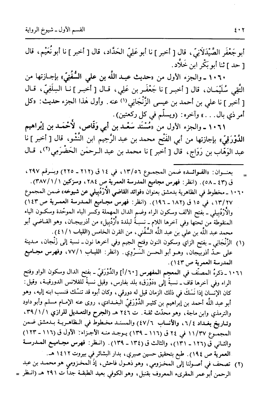 أبو جعفر الصيدلاني قال [أخبر] نا أبو علي الحداد قال [أخبر] نا أبو نعيم قال [حد] ثنا أبو بكر ابن خلاد. 1060 - والجزء الأول من "حديث عبد الله بن علي السفني" بإجازتها من التقي سليمان قال [أخبر] نا جعفر بن علي قال [أخبر] نا السلفي قال [أخبر] نا علي بن أحمد بن عيسى الزنجاني عنه. وأول هذا الجزء حديث: "كل أمر ذي بال ... " وآخره: (ويسلم في كل ركعتين). 1061 - والجزء الأول من "مسند سعيد بن أبي وقاص لأحمد بن إبراهيم الدوروقي" بإجازتها من أبي الفتح محمد بن عبد الرحيم ابن النشو قال [أخبر] نا عبد الوهاب بن رواج قال [أخبر] نا محمد بن عبد الرحمن الحضرمي قال