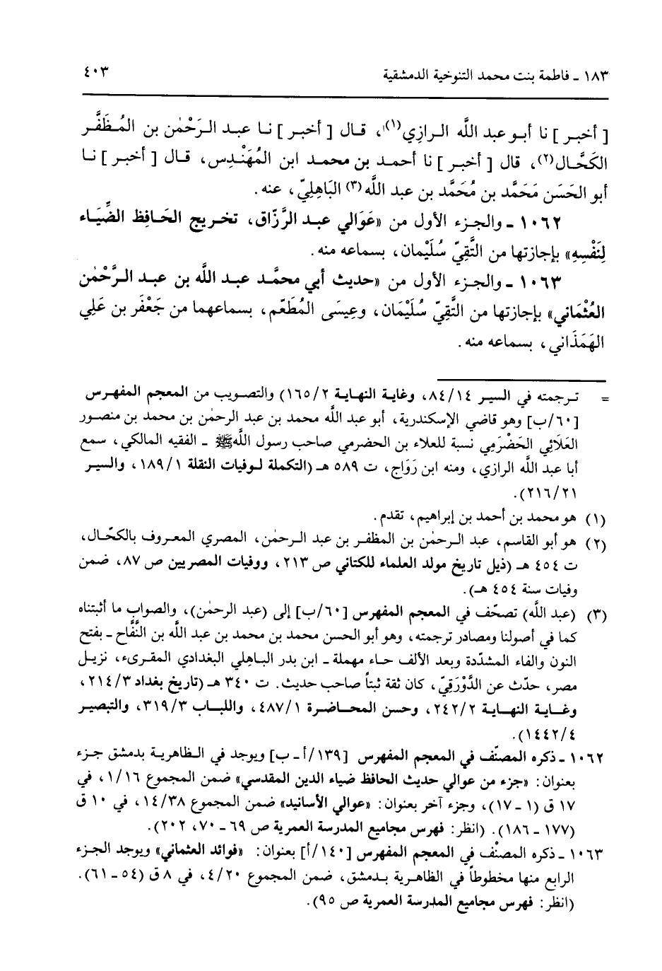 [أخبر] نا أبو عبد الله الرازي قال [أخبر] نا عبد الرحمن بن المظفر الكحال قال [أخبر] نا أحمد بن محمد ابن المهندس قال [أخبر] نا أبو الحسن محمد بن محمد بن عبد الله الباهلي عنه. 1062 - والجزء الأول من "عوالي عبد الرازق تخريج الحافظ الضياء لنفسه" بإجازتها من التقي سليمان بسماعه عنه. 1063 - والجزء الأول من "حديث أبي محمد عبد الله بن عبد الرحمن العُثماني" بإجازتها من التقي سليمان وعيسى المُطعم بسماعهما من جعفر بن علي الهمذاني بسماعه منه.
