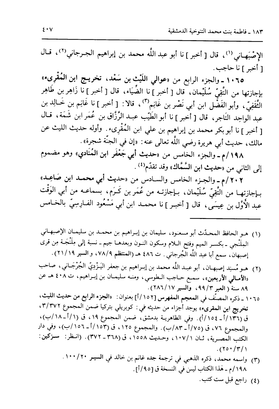 الإصبهاني قال [أخبر] نا أبو عبد الله محمد بن إبراهيم الجرجاني قال [أخبر] نا حاجب. 1065 - والجزء الرابع من "عوالي الليث بن سعد تخريج ابن المقرئ" بإجازتها من التقي سليمان قال [أخبر] نا الضياء قال [أخبر] نا زاهر بن طاهر الثقفي وأبو الفضل ابن أبي نصر بن غانم قالا: [أخبر] نا غانم بن خالد بن عبد الواحد التاجر قال [أخبر] نا أبو الطيب عبد الرازق بن عمر ابن شمة قال [أخبر] نا أبو بكر محمد بن إبراهيم بن علي ابن المقرئ. وأوله حديث الليث عن مالك حديث أبي هريرة رضي الله تعالى عنه: "إن في الجنة شجرة". 198/م- والجزء الخامس من "حديث أبي جعفر ابن المنادب" وهو مضموم إلى الثاني من "حديث ابن السماك" وقد تقدم. 202/م- والجزء الخامس والسادس من "حديث أبي محمد ابن صاعد" بإجازتها من التقي سليمان بإجازته من عٌمر بن كرم بسماعه من أبي الوقت عبد الأول بن عيسى قال [أخبر] نا محمد ابن أبي مسعود الفارسي بالخامس