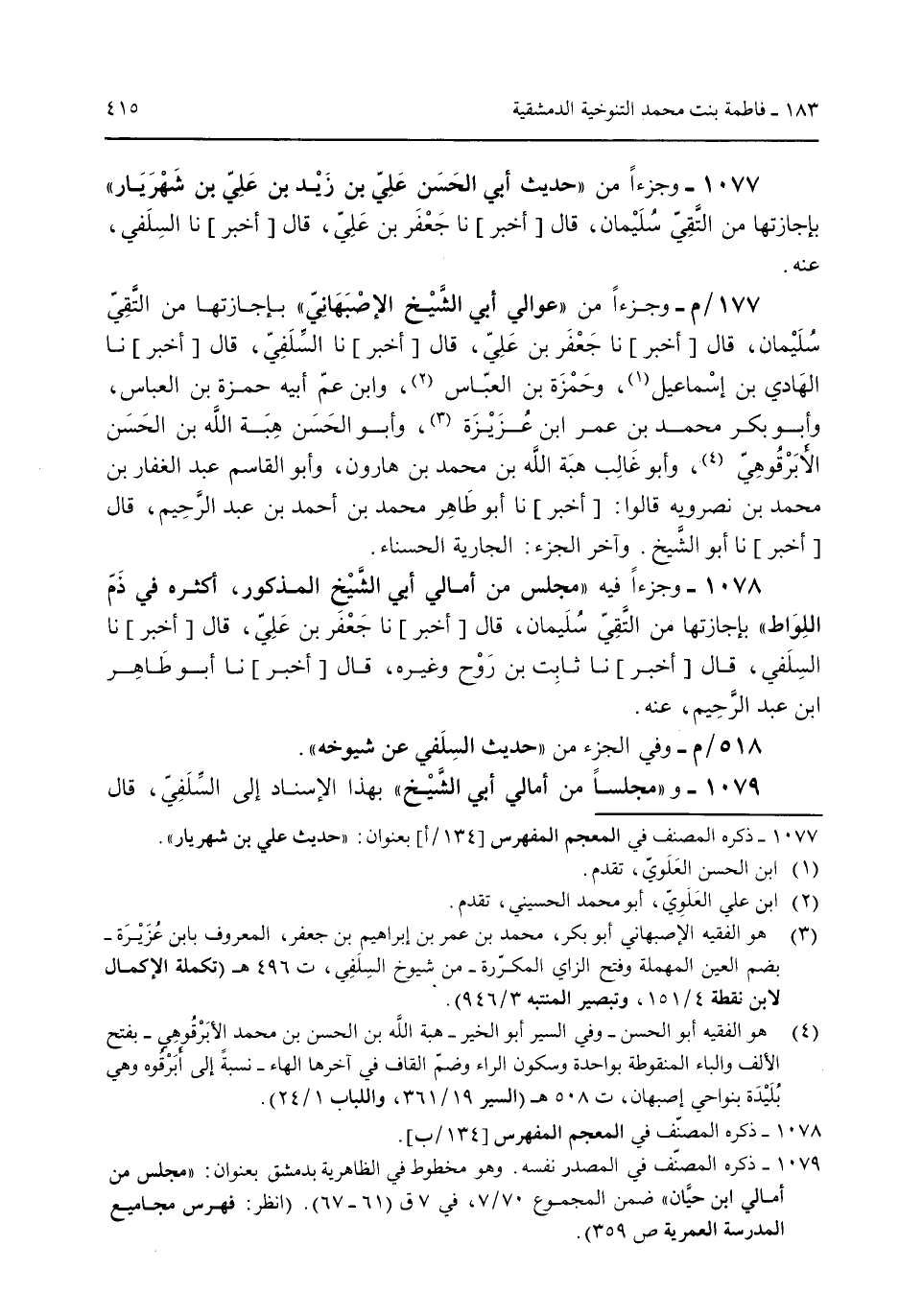 1077 - وجزءاً من "حديث أبي الحسن علي بن زيد بن علي بن شهريار" بإجازتها من التقي سليمان قال [أخبر] نا جعفر بن علي قال [أخبر] نا السلفي عنه. 177/م- وجزءاً من "عوالي أبي الشيخ الإصبهاني" بإجازتها من التقي سليمان قال [أخبر] نا جعفر بن علي قال [أخبر] نا السلفي عنه. 177/م- وجزءاً من "عوالي أبي الشيخ الإصبهاني" بإجازتها من التقي سليمان قال [أخبر] نا جعفر بن علي قال [أخبر] نا السلفي قال [أخبر] نا الهادي بن إسماعيل وحمزة بن العباس وابن عم أبيه حمزة بن العباس وأبو بكر محمد بن عمر ابن عُزيزة وأبو الحسن هبة الله بن الحسن الأبرقوهي وأبو غالب هبة الله بن محمد بن هارون وأبو القاسم عبد الغفار بن محمد بن نصرويه قالوا [أخبر] نا أبو طاهر محمد بن أحمد بن عبد الرحيم قال [أخبر] نا أبو الشيخ. وآخر الجزء: الجارية الحسناء. 1078 - وجزءاً فيه "مجلس من اماللي أبي الشيخ المذكور أكثره في ذم اللواط" بإجازتها من التقي سليمان قال [أخبر] نا جعفر بن علي قال [أخبر] نا السلفي قال [أخبر] نا ثابت بن روح وغيره قال [أخبر] نا أبو طاهر ابن عبد الرحيم عنه. 518/م- وفي الجزء من "حديث السلفي عن شيوخه". 1079 - و"مجلساً من أمالي أبي الشيخ" بهذا الإسناد إلى السلفي قال