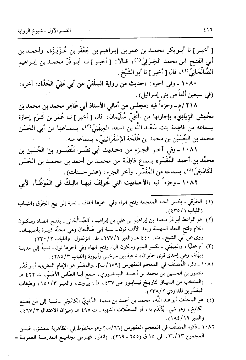 [أخبر] نا أبو بكر محمد بن عمر بن إبراهيم بن جعفر بن عُزيزة وأحمد بن أبي الفتح ابن محمد الخرقي قالا: [أخبر] نا أبو ذر محمد بن إبراهيم الصالحاني قال [أخبر] نا أبو الشيخ. 1080 - وفي آخره: "حديث من رواية السلفي عن أبي علي الحداد" آخره: (فى سبعين ألفاص من بني إسرائيل). 218/م- وجزءاً فيه "مجلس من أمالي الأستاذ أبي طاهر محمد بن محمد بن محمش الزيادي" بإجازتها من التقي سليمان قال [أخبر] نا عُمر بن كرم إجازة بسماعه من فاطمة بنت سعد الله بن أسعد الميهني بسماعها من أبي الحسن محمد بن الحسين بن محمد بن طلحة الإسفرائيني بسماعه منه. 1081 - وفي آخر الجزء من "حديث أبي نصر منصور بن الحسين بن محمد بن أحمد المُفسر" بسماع فاطمة من محمد بن أحمد بن محمد بن الحسن الكامخي بسماعه من المُفسر. وآخر الجزء: (عشر حسنات). 1082 - وجزءاً فيه "الأحاديث التي خولف فيها مالك في الموطأ لأبي