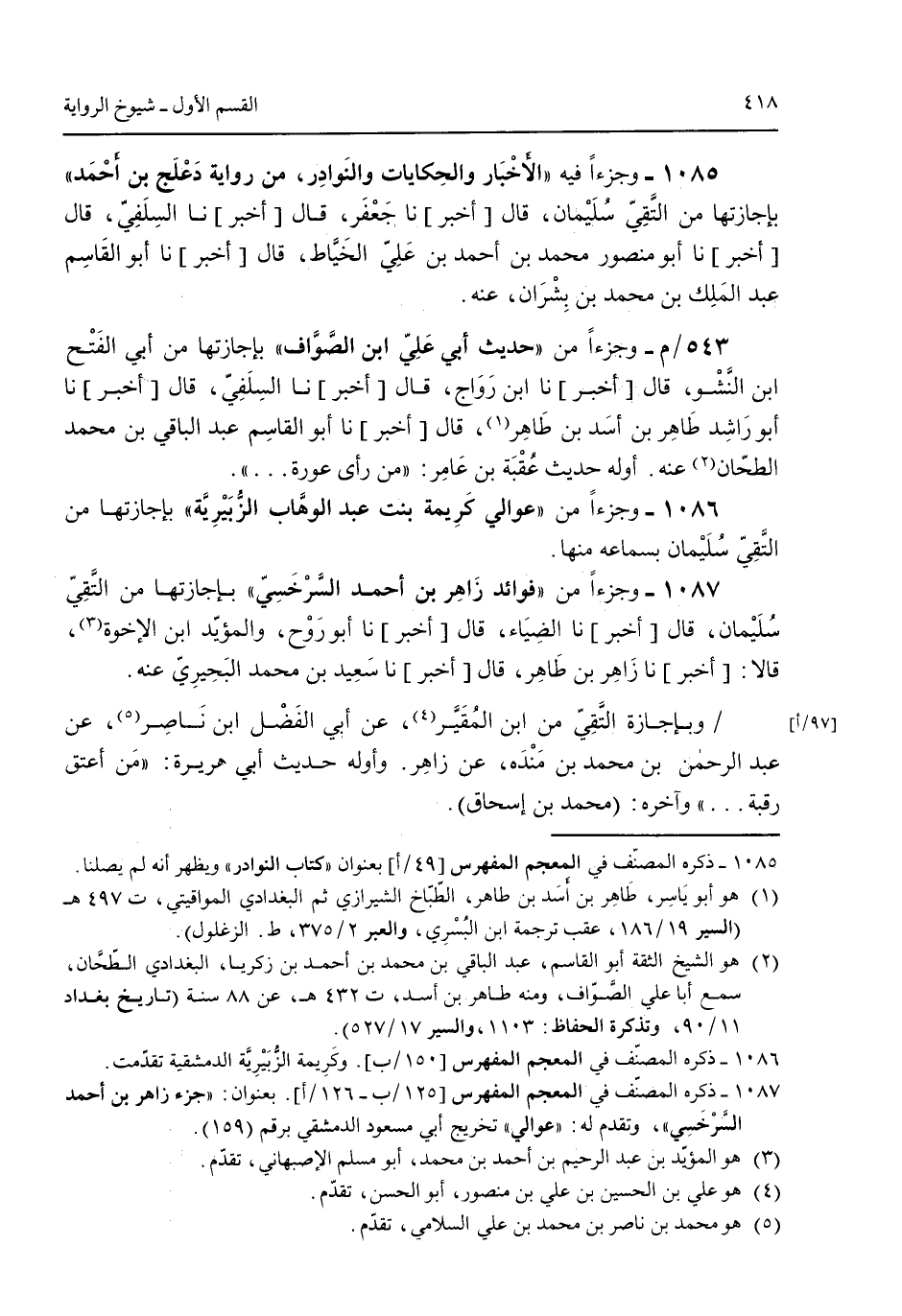 1085 - وجزءاً فيه "الأخبار والحكايات والنوادر من رواية دعلج بن أحمد" بإجازتها من التقس سليمان قال [أخبر] نا جعفر قال [أخبر] نا السلفي قال [أخبر] نا أبو منصور محمد بن أحمد بن علي الخياط قال [أخبر] نا أبو القاسم عبد الملك بن محمد بن بشران عنه. 543/م- وجزءاً من "حديث أبي علي ابن الصواف" بإجازتها من أبي الفتح ابن النشو قال [أخبر] نا ابن رواج قال [أخبر] نا السلفي قال [أخبر] نا أبو راشد طاهر بن أسد بن طاهر قال [أخبر] نا أبو القاسم عبد الملك بن محمد بن بشران عنه. 543/م- وجزءاً من "حديث أبي علي ابن الصواف" بإجازتها من أبي الفتح ابن النشو قال [أخبر] نا ابن رواج قال [أخبر] نا السلفي قال [أخبر] نا أبو راشد طاهر بن أسد بن طاهر قال [أخبر] نا أبو القاسم عبد الباقي بن محمد الطحان عنه. أوله حديث عُقبة بن عامر: "من رأى عورة .... ". 1086 - وجزءاً من "عوالي كريمة بنت عبد الوهاب الزُبيرية" بإجازتها من التقي سليمان بسماعه منها. 1087 - وجزءاً من "فوائد زاهر بن أحمد السرخسي" بإجازتها من التقي سُليمان قال [أخبر] نا الضياء قال [أخبر] نا أبو روح والمؤيد ابن الإخوة قالا