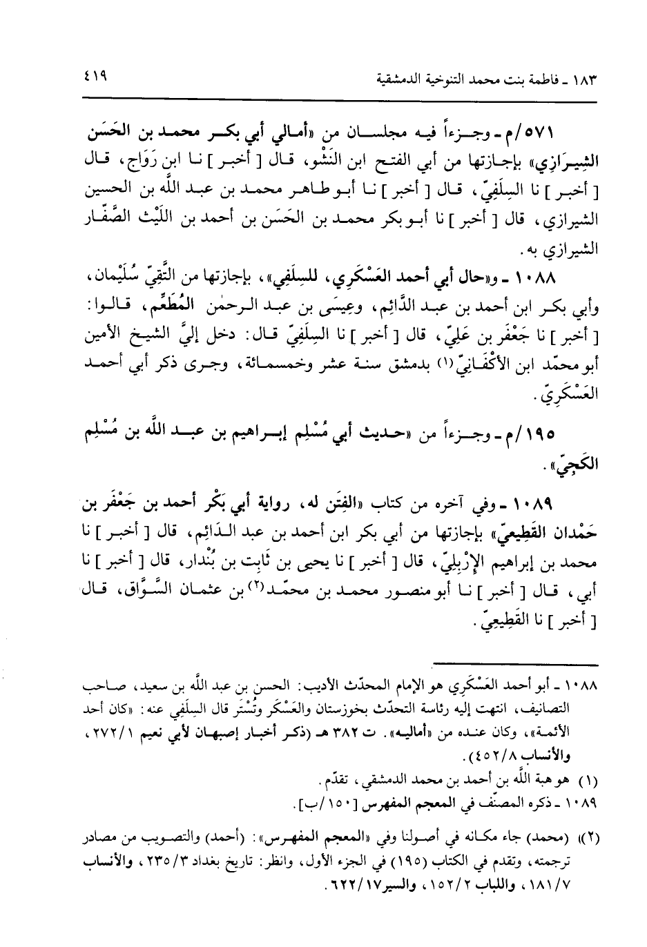 571/م- وجزءاً فيه مجلسان من "أمالي أبي بكر محمد بن الحسن الشيرازي" بإجازتها من أبي الفتح ابن النشو قال [أخبر] نا ابن رواج قال [أخبر] نا السلفي قال [أخبر] نا أبو طاهر محمد بن عبد الله بن الحسين الشيرازي قال [أخبر] نا أبو بكر محمد بن الحسن بن احمد بن الليث الصفار الشيرازي به. 1088 - و"حال أبي أحمد العسكري للسلفي" بإجازتها من التق سليمان وأبي بكر ابن أحمد بن عبد الدائم وعيسى بن عبد الرحمن المُطعم قالوا: [أخبر] نا جعفر بن علي قال [أخبر] نا السلفي قال: دخل الشيخ الأمين أبو محمد ابن الأكفاني بدمشق سنة عشر وخمسامائة وجرى ذكر أبي احمد العسكري. 195/م- وجزءاً من "حديث أبي مسلم إبراهيم بن عبد الله بن مسلم الكجي". 1089 - وفي آخره من كناب "الفتن له رواية أبي بكر أحمد بن حعفر بن حمدان القطيعي" بإجازتها من أبي بكر ابن أحمد بن عبد الدائم قال [أخبر] نا محمد بن إبراهيم الإربلي قال [أخبر] نا يحيى بن ثابت بن بندار قال [أخبر] نا أبي قال [أخبر] نا أبو منصور محمد بن محمد بن عثمان السواق قال [أخبر] نا القطيعي.
