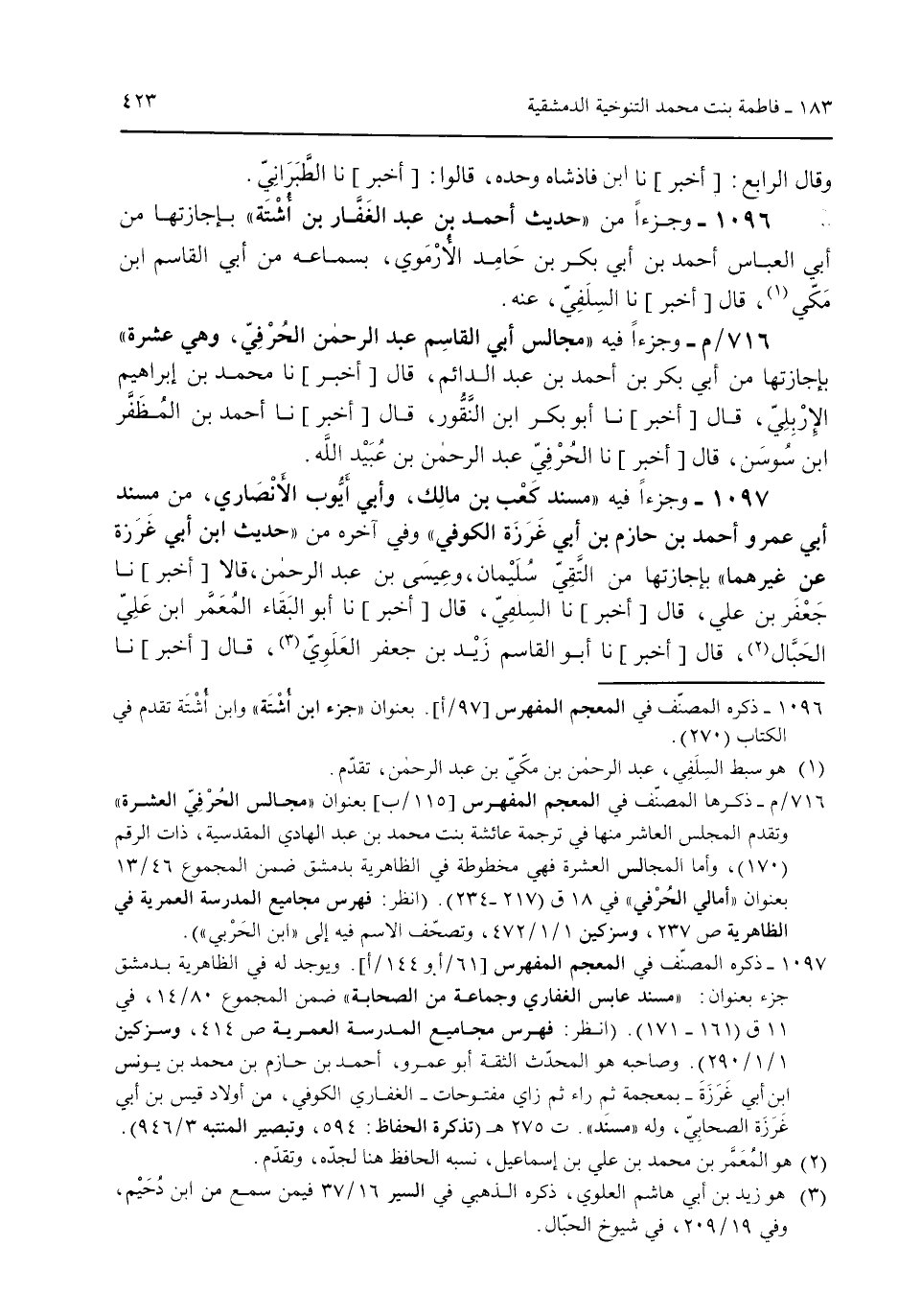 وقال الرابع: [أخبر] نا ابن فاذشاه وحده قالوا: [أخبر] نا الطبراني. 1096 - وجزءاً من "حديث أحمد بن عبد الغفار بن أُشتة" بإجازتها من أبي العباس أحمد بن أبي بكر بن حامد الأرموي بسماعه من أبي القاسم ابن مكي قال [أخبر] نا السلفي عنه. 716/م- وجزءاً فيه "مجالس أبي القاسم عبد الرحمن الحُرفي وهي عشرة" بإجازتها من أبي بكر بن أحمد بن عبد الدائم قال [أخبر] نا محمد بن إبراهيم الإربلي قال [أخبر] نا أبو بكر ابن النقور قال [أخبر] نا أحمد بن المظفر ابن سوسن قال [أخبر] نا الحُرفي عبد الرحمن بن عبيد الله. 1097 - وجزءاً فيه "مسند كعب بن مالك وأبي أيوب الأنصاري من مسند أبي عمرو أحمد بن حازم بن أبي غرزة الكوفي" وفي آخره من "حديث ابن أبي غرزة عن غيرهما" بإجازتها من التقي سليمان وعيسى بن عبد الرحمن قالا [أخبر] نا جعفر بن علي قال [أخبر] نا السلفي قال [أخبر] نا أبو البقاء المُعمر ابن علي الحبال قال [أخبر] نا أبو القاسم زيد بن جعفر العلوي قال [أخبر] نا