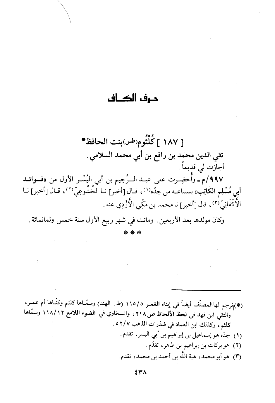 أجازت لي قديماً. 997/م- وأُحضرت على عبد الرحيم بن أبي اليُسر الأول من "فوائد أبي مسلم الكاتب" بسماعه من جده قال [أخبر] نا الخُشوعي قال [أخبر] نا الأكفاني قال [أخبر] نا محمد بن مكي الأزدي عنه. وكان مولدها بعد الأربعين وماتت في شهر ربيع الأول سنة خمس وثمانمائة.