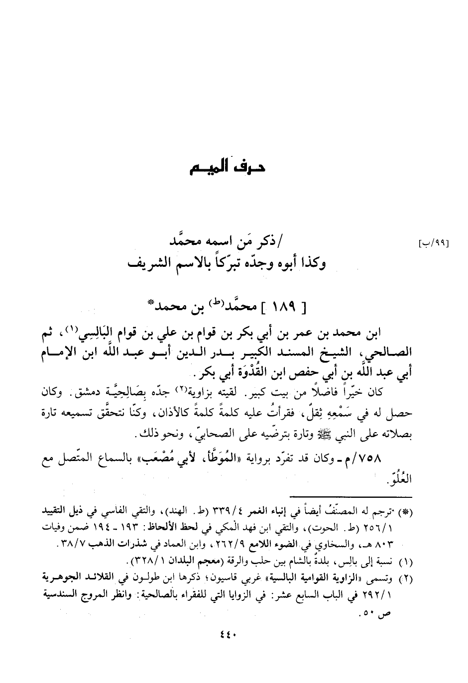 [189] محمد بن محمد ابن محمد بن عمر بن أبي بكر بن قوام بن علي بن قوام البالسي ثم الصالحي الشيخ المسند الكبير بدر الدين أبو عبد الله ابن الإمام أبي عبد الله بن أبي حصف ابن القدوة أبي بكر.