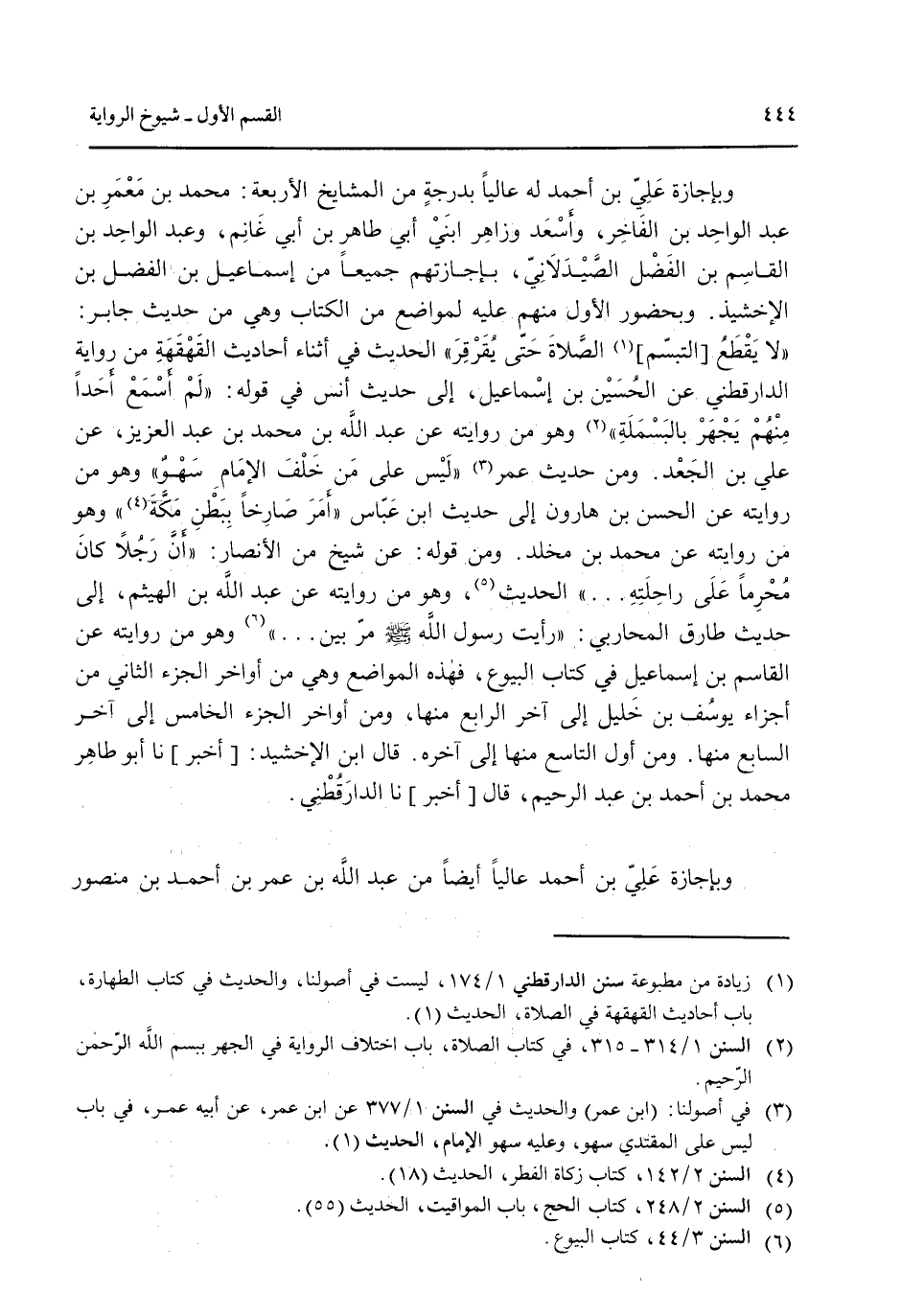 وبإجازة علي بن أحمد له عالياً بدرجة من المشايخ الأربعة: محمد بن معمر بن عبد الواحد بن الفاخر وأسعد وزاهر انبي أبي طاهر بن أبي غانم وعبد الواحد بن القاسم بن الفضل الصيدلاني بإجازتهم جميعاً من إسماعيل بن الفضل بن الإخشيذ. وبحضور الأول منهم عليه لمواضع من الكتاب وهي من حديث جابر: "لا يقطع التبسم الصلاة حتى يقرقر" الحديث فى أثناء أحاديث القهقهة من رواية الدراقطني عن الحسين بن إسماعيل إلى حيدث أنس في قوله: "لم أسمع احداً منهم يجهر بالبسملة" وهو من رواته عن عبد الله بن محمد بن عبد العزيز عن علي بن الجعد. ومن حديث عمر "ليس على من خلف الإمام سهو" وهو من روايته عن الحسن بن هارون إلى حديث ابن عباس "أمر صارخاً ببطن مكة" وهو من روايته عن محمد بن مخلد. ومن قوله: عن شيخ من الأنصار: "أن رجلاً كان مُحرماً على راحلته ... " الحديث وهو من روايته عن عبد الله بن الهيثم إلى حديث طارق المحاربي: "رأيت رسول الله صلى الله عليه وسلم مر بين ... " وهو من روايته عن القاسم بن إسماعيل في كتاب البيوع فهذه المواضع وهي من أواخر الجزء الثانب من أجزاء يوسف بن خليل إلى آخر الرابع منها ومن أواخر الجزء الخامس إلى آخر السابع منها. ومن أول التاسع منها إلى آخره. قال ابن الإخشيد [أخبر] نا أبو طاهر محمد بن أحمد بن عبد الرحيم قال [أخبر] نا الدراقطني. وبإجازة علي بن أحمد عالياً أيضاً من عبد الله بن عمر بن أحمد بن منصور