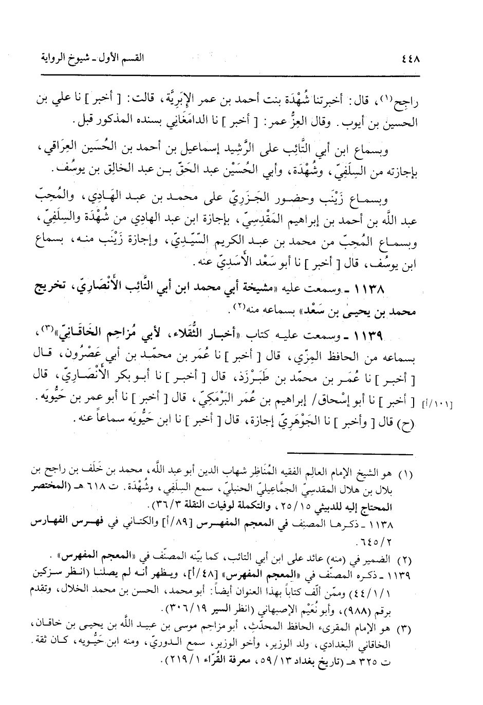 راجح قال: أخبرتنا شُهدة بنت أحمد بن عمر الإبرية قالت [أخبر] نا علي بن الحسين بن أيوب. وقال العز عمر: [أخبر] نا الدامغان بسنده المذكور قبل. وبسماع ابن أبي التائب على الرشيد إسماعيل بن أحمد بن الحسين العراقي بإجازته من السلفي وشُهدة وأبي الحسين عبد الحق بن عبد الخالق بن يوسف. وبسماع زينب وحضور الجزري على محمد بن عبد الهادي والمحب عبد الله بن أحمد بن إبراهيم المقدسي بإجازة ابن عبد الهادي من شُهدة والسلفي وبسماع المحب من محمد بن عبد الكريم السيدي وإجازة زنب منه بسماع ابن يوسف قال [أخبر] نا أبو سعد الأسدي عنه. 1138 - وسمعت عليه "مشيخة أبي محمد ابن أبي التائب الأنصاري تحريج محمد بن يحيى بن سعد" بسماعه منه 1139 - وسمعت عليه كتاب "أخبار الثُقلاء لأبي مزاحم الخاقاني" بسماعه من الحافظ المزي قال [أخبر] نا عُمر بن محمد بن أبي عصرون قال [أخبر] نا عمر بن محمد بن طبرزذ قال [أخبر] نا أبو بكر الأنصاري قال [أخبر] نا أبو إسحاق إبراهيم بن عُمر البرمكي قال [أخبر] نا أبو عمر بن حيويه. قال [أخبر] نا الجوهري إجازة قال [أخبر] نا ابن حيويه سماعاً عنه.