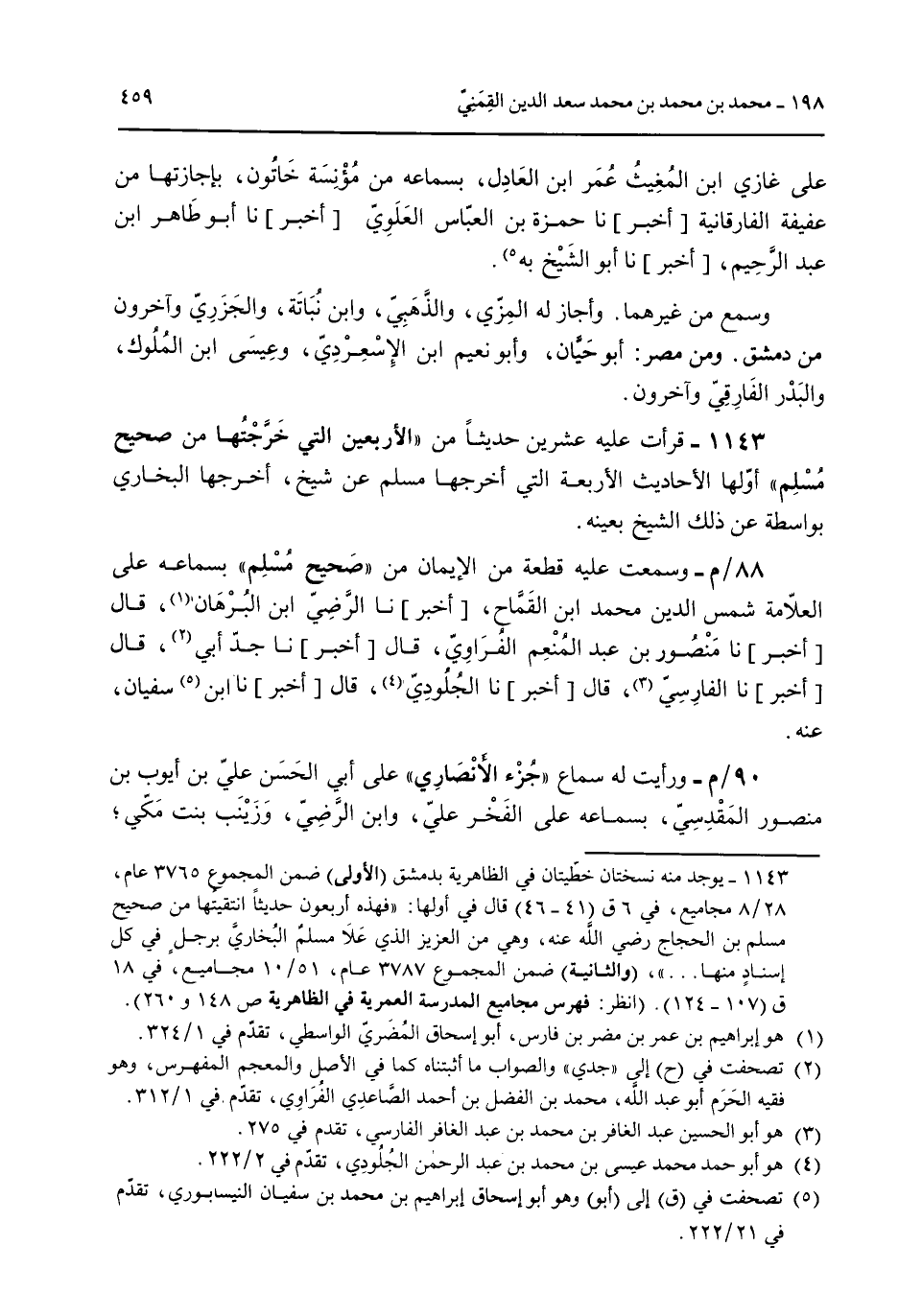 على غازي ابن المغيث عمر ابن العادل بسماعه من مؤنسة خاتون بإجازتها من عفيفة الفارقانية [أخبر] نا حمزة بن العباس العلوي [أخبر] نا أبو طاهر بن عبد الرحيم [أخبر] نا أبو الشيخ به. وسمع من غيرهما. وأجاز له المزي والذهبي وابن نُباتة والجزري وآخرون من دمشق. ومن مصر: أبو حيان وأبو نعيم ابن الإسعردي وعيسى ابن الملوك والبدر الفارقي وآخرون. 1143 - قرأت عليه عشرين حديثاً من "الأربعين التي خرجتها من صحيح مسلم" أولها الأحاديث الأربعة التي أخرجها مسلم عن شيخ أخرجها البخاري بواسطة عن ذلك الشيخ بعينه. 88/م- وسمعت عليه قطعة من الإيمان من "صحيح مسلم" بسماعه على العلامة شمس الدين محمد ابن القماح [أخبر] نا الرضي ابن البرهان قال [أخبر] نا منصور بن عبد المنعم الفراوي قال [أخبر] نا جد أبي قال [أخبر] نا الفارسي قال [أخبر] نا الجلودي قال [أخبر] نا ابن سفيان عنه. 90/م- ورأيت له سماع "جزء الأنصاري" على أبي الحسن علي بن أيوب بن منصور المقدسي بسماعه على الفخر علي وابن الرضي وزينب بنت مكي