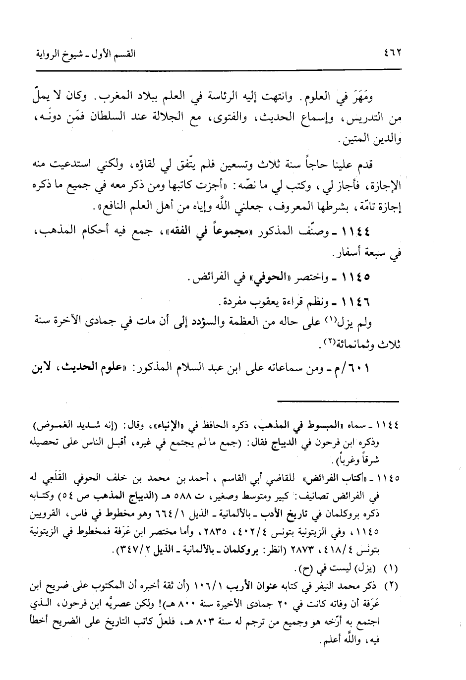 ومهر في العلوم. وانتهت إليه الرئاسة في العلم ببلاد المغرب. وكان لا يمل من التدريس وإسماع الحديث والفتوى مع الجلالة عند السلطان فمن دونه والدين المتين. قدم علينا حاجاً سنة ثلاث وتسعين فلم يتفق لي لقاؤه ولكني استدعيت منه الإجازة فأجاز لي وكتب لي ما نصه: "أجزت كاتبها ومن ذكر معه في جميع ما ذكره إجازة تامة بشرطها المعروف جعلني الله وإياه من أهل العلم النافع". 1144 - وصنف المذكور "مجموعاً في الفقه" جمع فيه أحكام المذهب في سبعة أسفار. 1145 - واختصر "الحوفي" في الفرائض. 1146 - ونظم قراءة يعقوب مفردة. ولم يزل على حاله من العظمة والسؤدد إلى ان مات في جمادى الآخره سنة ثلاث وثمانمائة. 601/م- ومن سماعاته على ابن عبد السلام المذكور: "علوم الحديث لابن