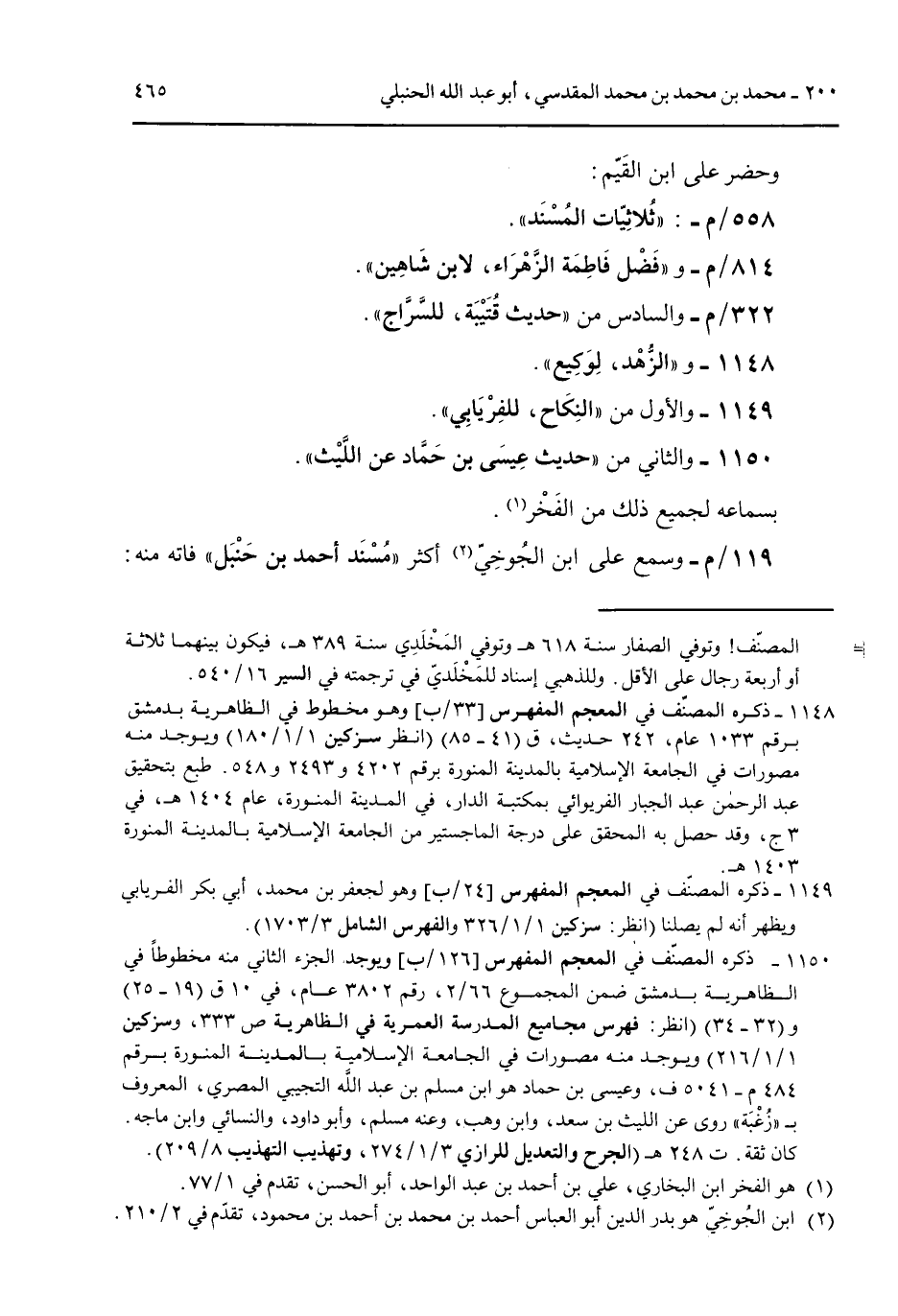 وحضر على ابن القيم: 558/م-: "ثلاثيات المسند". 814/م- و"فضل فاطمة الزهراء لابن شاهين". 322/م- والسادس من "حديث قُتيبة للسراج". 1148 - و"الزهد لوكيع". 1149 - والأول من "النكاح للفريابي". 1150 - والثاني من "حديث عيسى بن حماد عن الليث". بسماعه لجميع ذلك من الفخر. 119/م- وسمع على ابن الجوخي أكثر "مسند أحمد بن حنبل" فاته منه: