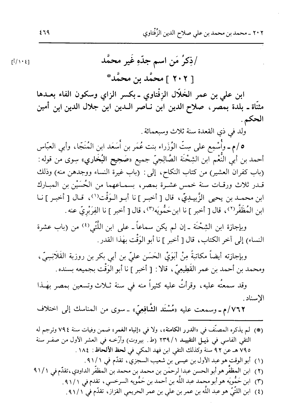 [202] محمد بن محمد ابن علي بن عمر الخلال الزفتاوي -بكسر الزاي وسكون الفاء بعدها مثناه- بلد بمصر صلاح الدين ابن ناصر الدين ابن جلال الدين ابن أمين الحكم.