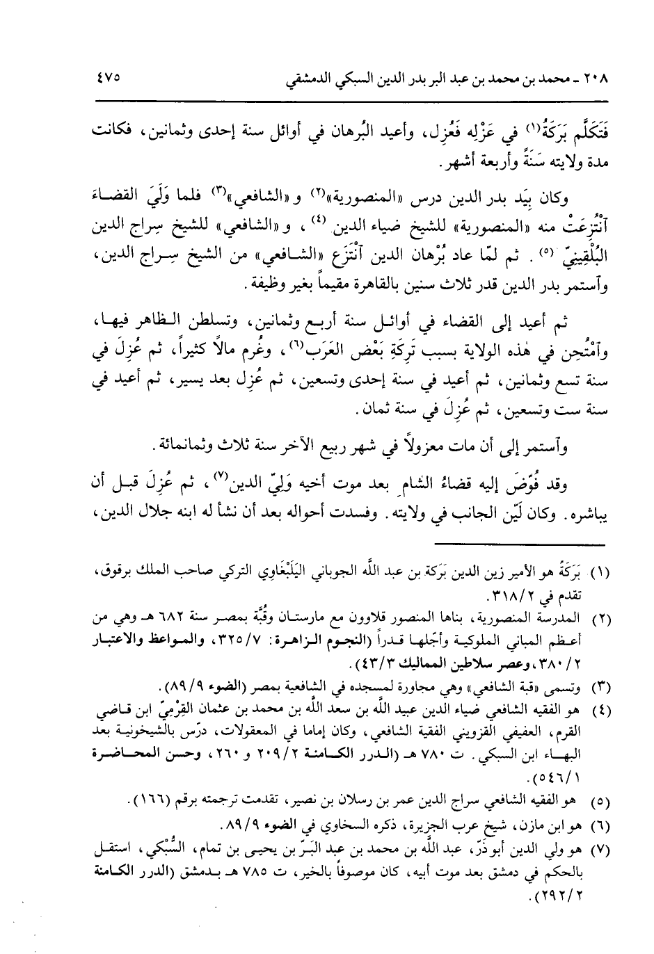فتكلم بركة في عزلة فعزل وأعيد البرهان في اوائل سنة إحدى وثمانين فكانت مدة ولايته سنة وأربعة أشهر. وكان بيد بدر الدين درس "المنصورية" و"الشافعي" فلما ولي القضاء انتزعت منه "المنصورية" للشيخ ضياء الدين و"الشافعي" للشيخ سراج الدين اللُلقيني ثم لما عاد بُرهان الدين انتزع "الشافعي" من الشيخ سراج الدين واستمر بدر الدين قدر ثلاث سنين بالقاهرة مقيماً بغير وظيفة. ثم أعيد إلى القضاء في اوائل سنة أربع وثمانين وتسلطن الظاهر فيها وامتحن في هذه الولاة بسبب تركة بعض العرب وغُرم مالاً كثيراً ثم عُزل في سنة تسع وثمانين ثم أعيد في سنة إحدى وتسعين ثم عُزل بعد يسير ثم أعيد في سنة ست وتسعين ثم عُزل في سنة ثمان. واستمر إلى أن مات معزولاً في شهر ربيع الآخر سنة ثلاث وثمانمائة. وقد فوض إليه قضاء الشام بعد موت أخيه ولي الدين ثم عُزل قبل أن يباشره. وكان لين الجانب ف ولاته. وفسدت احواله بعد ان نشأ له ابنه جلال الدين