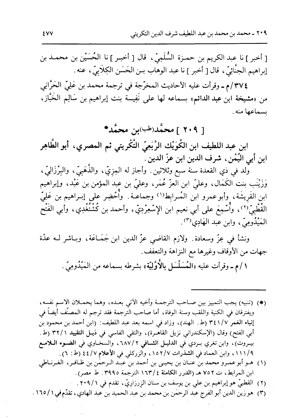 [209] محمد (طب) بن محمد ابن عبد اللطيف ابن الكويك الربعي التكريتي ثم المصري أبو الطاهر ابن أبي اليمن شرف الدين ابن عز الدين.