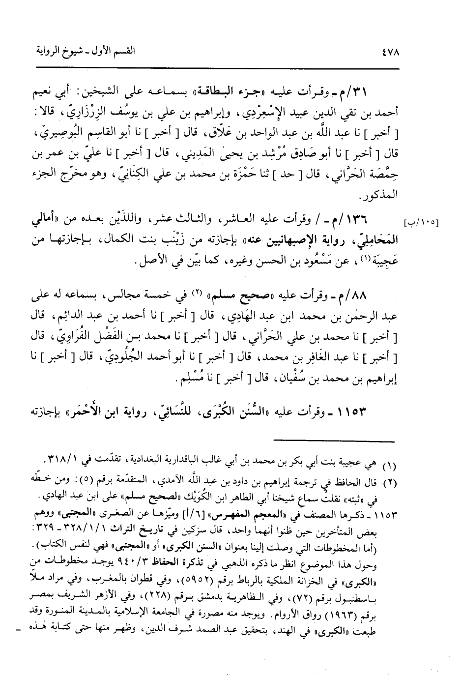 31/م- وقرأت عليه "جزء البطاقة" بسماعه على الشيخين: أبي نعيم أحمد بن تقي الدين عبد الإسعردي وإبراهيم بن علي بن يوسف الزرزاري قالا: [أخبر] نا عبد الله بن عبد الواحد بن علاق قال [أخبر] نا أبو القاسم البوصيري قال [أخبر] نا أبو صادق مرشد ين يحيى المديني قال [أخبر] نا علي بن عمر بن حمصة الحراني قال [حد] ثنا حمزة بن محمد بن علي الكناني وهو مخرج الجزء المذكور. 136/م- وقرأت عليه العاشر والثالث عشر واللذين بعده من "أمالي المحاملي رواية الإصبهاني عنه" بإجازته من زينب بنت الكمال بإجازتها من عجيبة عن مسعود بن الحسن وغيره كما بين فى الأصل. 88/م- وقرأت عليه "صحيح مسلم" في خمسة مجالس بسماعه له على عبد الرحمن بن محمد ابن عبد الهادي قال [أخبر] نا أحمد بن عبد الدائم قال [أخبر] نا محمد بن علي الحراني قال [أخبر] نا محمد بن الفضل الفراوي قال [أخبر] نا عبد الغافر بن محمد قال [أخبر] نا أبو أحمد الجُلُودي قال [أخبر] نا إبراهيم بن محمد بن سُفيان قال [أخبر] نا مسلم. 1153 - وقرأت عليه "السنن الكبرى للنسائي رواية ابن الأحمر" بإجازته