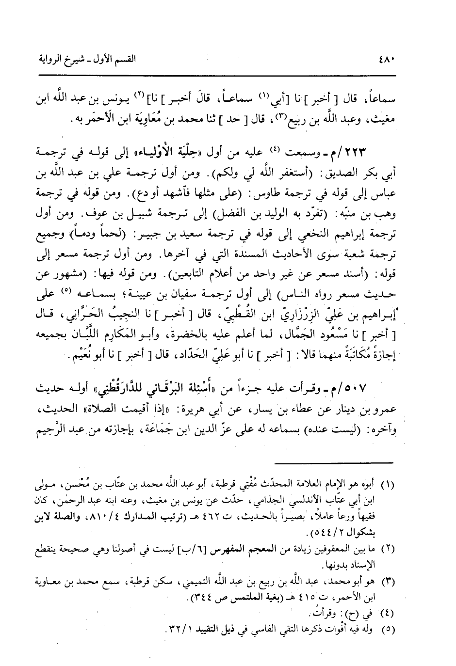 سماعاً قال [أخبر] نا أبي سماعاً قال [أخبر] نا يونس بن عبد الله ابن مغيث وعبد الله بن ربيع قال [حد] ثنا محمد بن معاوية ابن الأحمر به. 223/م- وسمعت عليه من أول "حلية الأولياء" إلى قوله في ترجمة أبي بكر الصديق: (أستغفر الله لي ولكم). ومن أول ترجمة علي بن عبد الله بن عباس إلى قوله في ترجمة طاوس: (على مثلها فاشهد أودع). ومن قوله في ترجمة وهب بن منبه: (تفرد به الوليد بن الفضل) إلى ترجمة شبيل بن عوف. ومن أول ترجمة إبراهيم النخعي إلى قوله في ترجمة سعيد بن جبير: (لحماً ودماً) وجميع ترجمة شعية سوى الأحاديث المسنده التي في آخرها. ومن أول ترجمة مسعر إلى قوله: (أسند مسعر عن غير واحد من أعلام التابعين). ومن قوله فيها: (مشهور عن حديث مسعر رواه الناس) إلى أول ترجمة سفيان بن عيينة بسماعه على إبراهيم بن علي الزرزاري ابن القُطبي قال [أخبر] نا النجيب الحراني قال [أخبر] نا مسعود الجمال لما أعلم عليه بالخضرة وأبو المكارم اللبان بجميعه إجازة مكاتبة منهما قالا: [أخبر] نا أبو علي الحداد قال [أخبر] نا أبو نعيم. 507/م- وقرأت عليه جزءاً من "أسئلة البرقاني للدراقطني" أوله حديث عمرو بن دينار عن عطاء بن يسار عن أبي هريرة: "إذا أقيمت الصلاة" الحديث وآخره: (ليست عنده) بسماعه له على عز الدين ابن جماعة بإجازته من عبد الرحيم