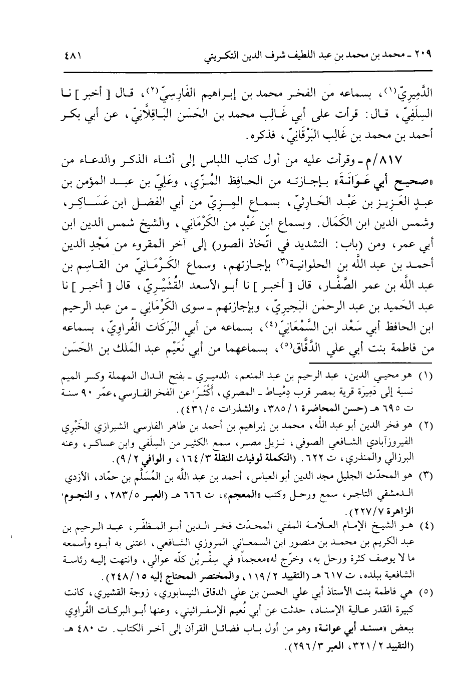 الدميري بسماعه من الفخر محمد بن إبراهيم الفارسي قال [أخبر] نا السلفي قال: [أخبر] نا قرأت على أبي غالب محمد بن الحسن الباقلاني عن أبي بكر أحمد بن محمد بن غالب البرقاني فذكره. 817/م- وقرأت عليه من أول كتاب اللباس إلى أثناء الذكر والدعاء من "صحيح أبي عوانة" بإجازته من الحافظ المزي وعلي بن عبد المؤمن بن عبد العزيز بن عبد الحارثي بسماع المزي من أبي الفضل ابن عساكر وشمس الدين ابن الكمال. وبسماع ابن عبد من الكرماني والشيخ شمس الدين ابن أبي عمر ومن (باب: التشديد في اتخاذ الصور) إلى آخر المقروء من مجد الدين أحمد بن عبد الله بن الحلوانية بإجازتهم وسماع الكرماني من القاسم بن عبد الله بن عمر الصفار قال [أخبر] نا أبو الأسعد القُشيري قال [أخبر] نا عبد الحميد بن عبد الرحمن البحيري وبإجازتهم -سوى الكرماني- من عبد الرحيم ابن الحافظ أبي سعد ابن السمعاني بسماعه من أبي البركات الفراوي بسماعه من فاطمة بنت أبي علي الدقاق بسماعهما من أبي نعيم عبد الملك بن الحسن