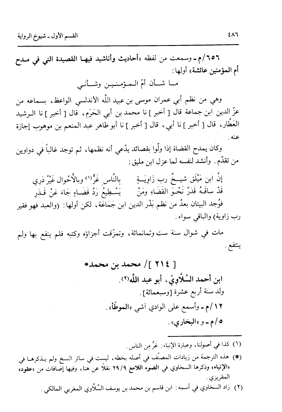 [214] محمد بن محمد ابن أحمد السلاوي أبو عبد الله ولد سنة أربع عشرة وسبعمائة 12/م- وأسمع على الوادي آشي "الموطأ"