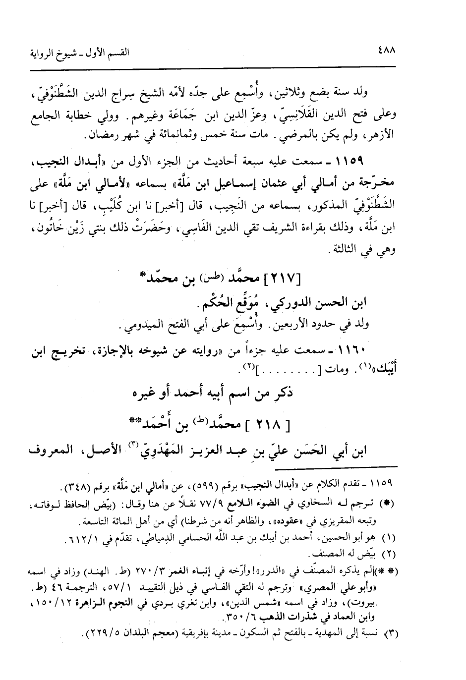 ولد في حدود الأربعين وأسمع على أبي الفتح الميدومي. 1160 - سمععت عليه جزءاً من "روايته عن شيوخه بالإجازة تخريج ابن أيبك". ومات [ ... ] ذكر من اسم أبيه أحمد أو غيره [218] محمد بن أحمد بن أبي الحسن علي بن عبد العزيز المهدوي الأصل، المعروف