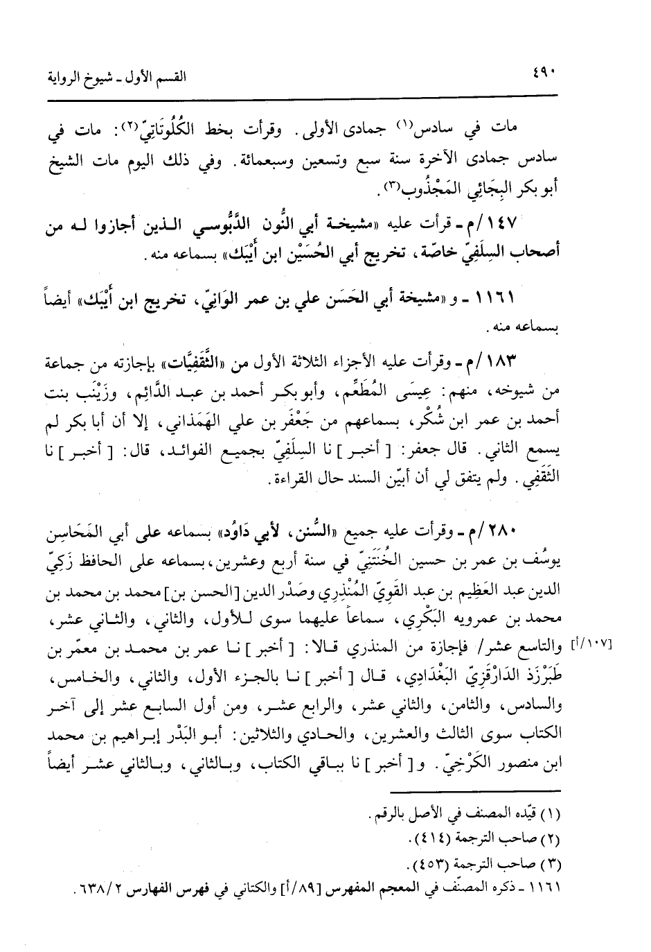 مات في سادس جمادى الأولى. وقرات بخط الكلوتاتي: مات في سادس جمداى الآخره سنة سبع وتسعين وسبعمائة. وفي ذلك اليوم مات الشيخ أبو بكر البجائي المجذوب. 147/م- قرأت عليه "مشيخة أبي النون الدبوسي الذين أجازوا له من أصحاب السلفي خاصة تخريج أبي لحسين ابن أيبك" بسماعه منه. 1161 - و"مشيخة أبي الحسن علي بن عمر الواني تخريج ابن أيبك" أيضاًً بسماعه منه. 183/م- وقرات عليه الأجزاء الثلاثة الأول من "الثقفيات" بإجازته من جماعة من شيوخه منهم: عيسى المطعم وأبو بكر أحمد بن عبد الدائم وزينب بنت أحمد بن عمر ابن شُكر بسماعهم من جعفر بن علي الهمذاني إلا أن أبا بكر لم يسمع الثاني. قال جعفر: [أخبر] نا السلفي بجميع الفوائد قال [أخبر] نا الثقفي. ولم يتفق لي أن أبين السند حال القراءة. 280/م- وقرات عليه جميه "السنن لأبي داود" بسماعه على أبي المحاسن يوسف بن عمر بن حسين في سنة أربع وعشرين بسماعه على الحافظ زكي الدين عبد العظيم بن عبد القوي المنذري وصدر الدين الحسن بن محمد بن محمد بن محمد بن عمروية البكري سماعاً عليهما سوى للاول والثانب والثاني عشر والتاسع عشر فإجازة من المنذري قالا: [أخبر] نا عمر بن محمد بن معمر بن طبرزذ الدارقزي البغدادي قال [أخبر] نا بالجزء الأول والثاني والخامس والسادس والثامن والثانب عشر والرابع عشر من أول السابع عشر إلى آخر الكتاب سوى الثالث والعشرين والحادي والثلاثين: أبو الدبر إبراهيم بن محمد ابن منصور الكرخي. و [أخبر] نا بباقي الكتاب وبالثاني وبالثاني عشر أيضاً