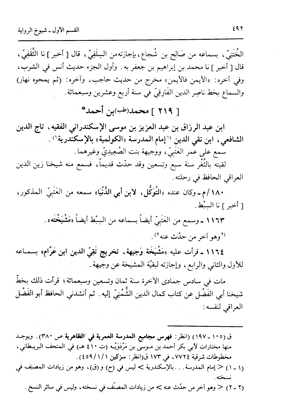 [219] محمد (طب) بن أحمد ابن عبد الرازق بن عبد العزيز بن موسى الإسكندارني الفقيه تاج الدين الشافع ابن تقي الدين إمام المدرسة "الكولمية" بالإسكندرية.