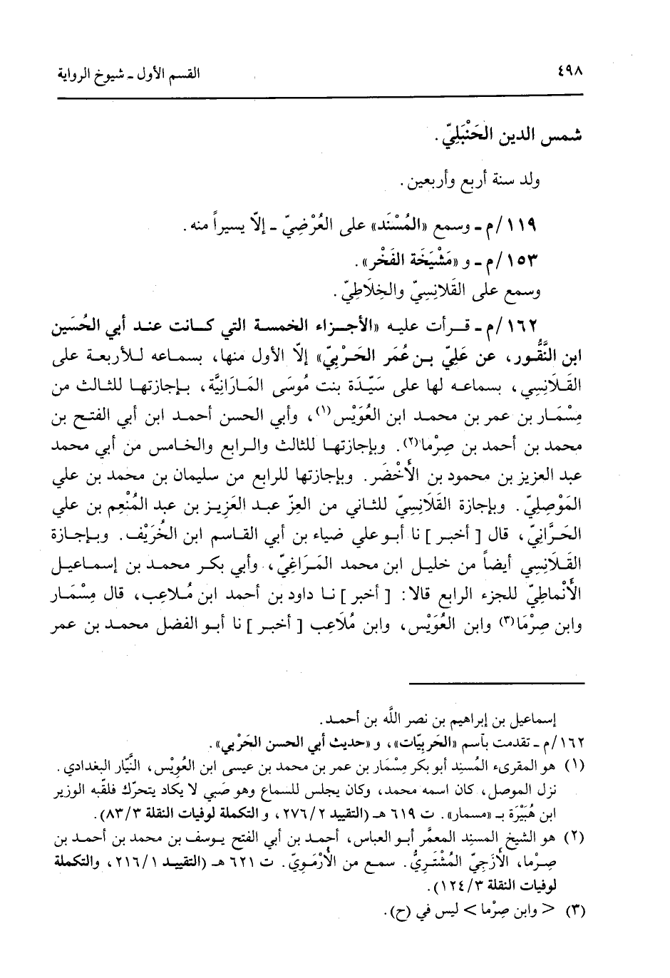 شمس الدين الحنبلي. ولد سنة أربع وأربعين. 119/م- وسمع "المسند" على العرضي- إلا يسيراً منه. 153/م- و "مشيخة الفخر". وسمع على القلانسي والخلاطي. 162/م- قرأت عليه "الأجزاء الخمسة التي كانت عند أبي الحسين ابن النقور عن علي بن عمر الحرب" إلا الأول منها بسماعه للأربعة على القلانسي بسماعه لها على سيدة بنت موصى المارانية بإجازتها للثالث من مسمار بن عمر بن محمد ابن العويس وأبي الحسن احمد ابن أبي الفتح بن محمد بن أحمد بن صِرما وبإجازتها للثالث والرابع والخامس من أبي محمد عبد العزيز بن محمود بن الأخضر وبإجازتها للرابع من سليمان بن محمد بن علي الموصلي. وبإجازى القلانسية للثاني من العز عبد العزيز بن عبد المنعم بن علي الحراني قال [أخبر] نا أبو علي ضياء بن أبي القاسم ابن الخريف وبإجازة القلانسيى أيضاً من خليل ابن محمد المراغي وأبي بكر محمد بن إسماعيل الأنماطي للجزء الرابع قالا: [أخبر] نا بن أحمد ابن ملاعب قال مسمار وابن صرما وابن العويس وابن ملاعب [أخبر] نا أبو الفضل محمد بن عمر