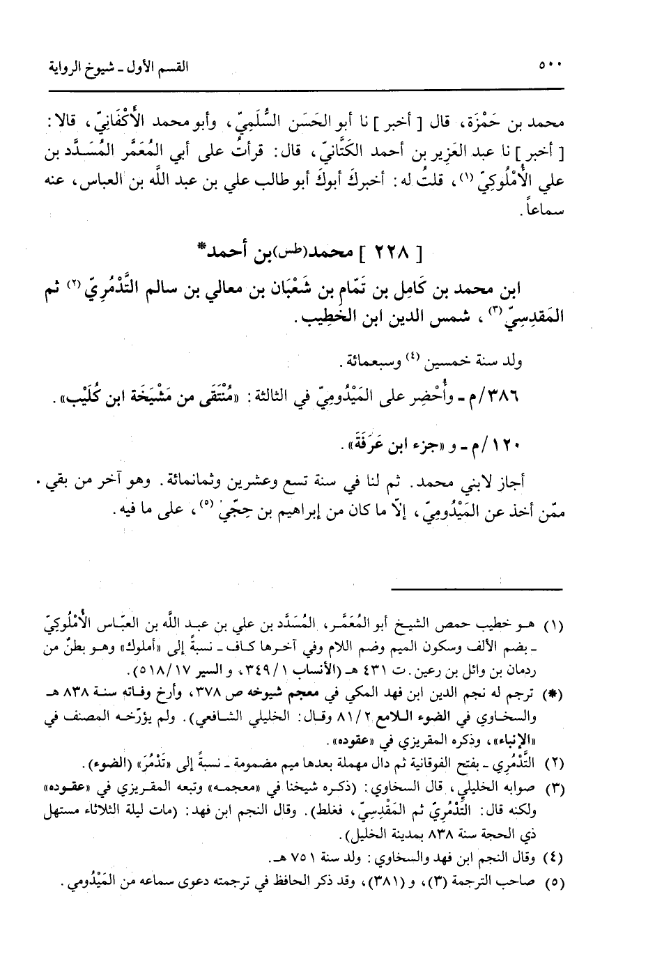 [228] محمد (طس) بن أحمد ابن محمد بن كامل بن تمام بن شعبان بن معالي بن سالم التدمري ثم المقدسي شمس الدين ابن الخطيب.