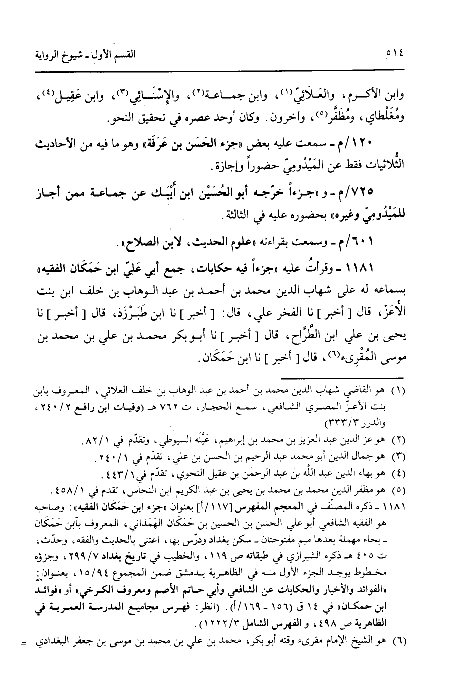 وابن الأكرم والعلائي وابن جماعة والإسنائي وابن عقيل ومُغلطاي ومُظفر وآخرون. وكان اوحد عصره في تحقيق النحو. 120/م- سمعت عليه بعض "جزء الحسن بن عرفة" وهو ما فيه من الأحاديث الثلاثيات فقط عن الميدومي حضوراً وغجازة. 725/م- و"جزءاً خرجه أبو الحسين ابن أيبك عن جماعة ممن اجاز للميدومي وغيره" بحضوره عليه في الثالثة. 01/م- وسمعت بقراءته "علوم الحديث لابن الصلاح". 1181 - وقرأت عليه "جزءاً فيه حكايات جمع أبي علي ابن حكمان الفقيه" بسماعه له على شهاب الدين محمد بن احمد بن عبد الوهاب بن خلف ابن بنت الأعز قال [أخبر] نا الفخر علي قال [أخبر] نا ابن طبرزذ قال [أخبر] نا يحيى بن علي ابن الطراح قال [أخبر] نا أبو بكر محمد بن علي بن محمد بن موسى المقرئ قال [أخبر] نا ابن حكمان.