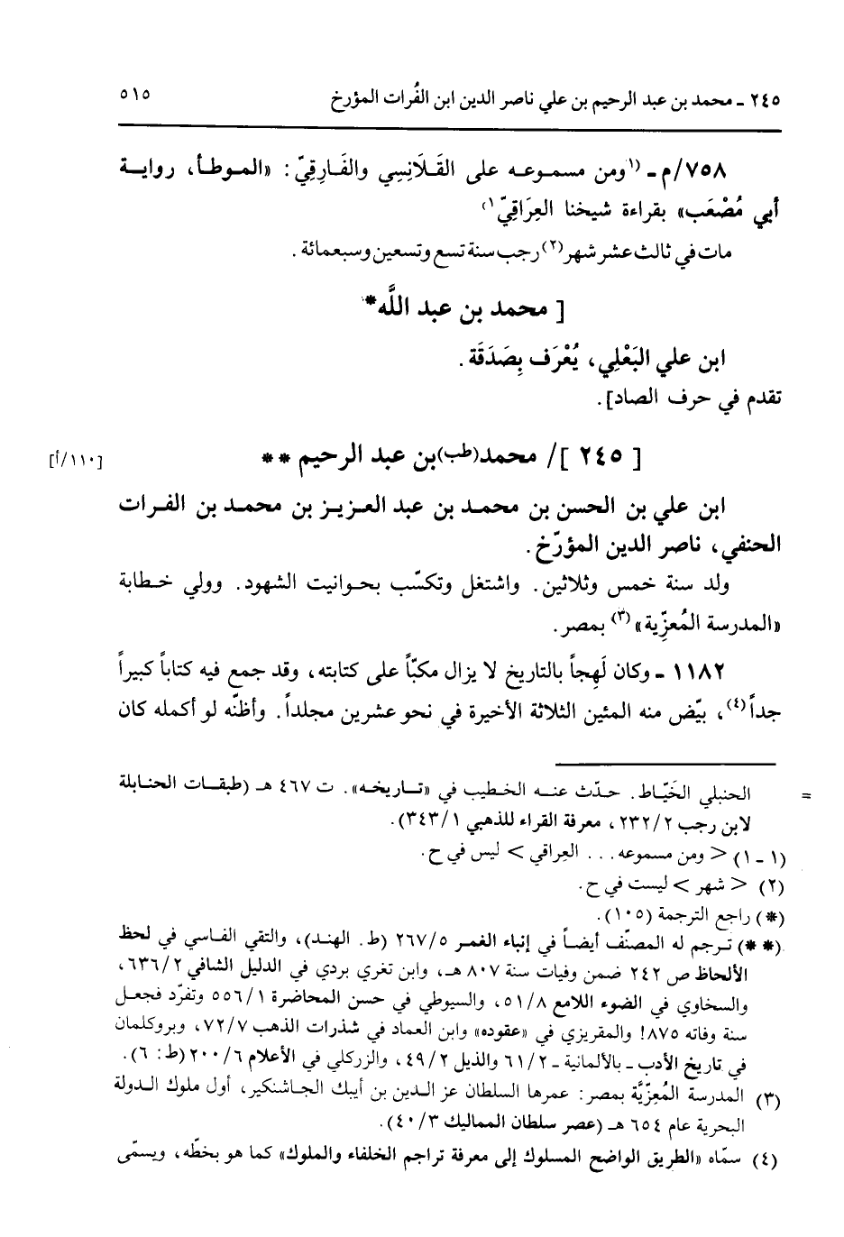 [245] محمد (طب) بن عبد الرحيم ابن علي بن الحسن بن محمد بن عبد العزيز بن محمد بن الفرات الحنفي ناصر الدين المؤرخ.