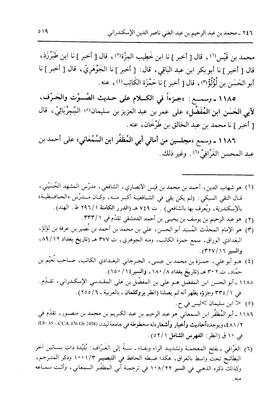 محمد بن قيس قال [أخبر] نا ابن خطيب المِزة قال [أخبر] نا ابن طبرزذ قال [أخبر] نا أبو بكر ابن عبد الباقي قال [أخبر] نا الجوهري قال [أخبر] نا أبو الحسن لؤلؤ قال [أخبر] نا حمزة الكاتب عنه. 1185 - وسمع: "جزءاً في الكلام على حديث الضوت والحرف لأبي الحسن ابن المفضل" على عمر بن عبد العزيز بن سليمان السمربائي قال [أخبر] نا محمد بن عبد الخالق بن طرخان عنه. 1186 - وسمه "مجلسين من أمالي أبي المظفر ابن السمعاني" على أحمد بن عبد المحسن الغرافي وغير ذلك.
