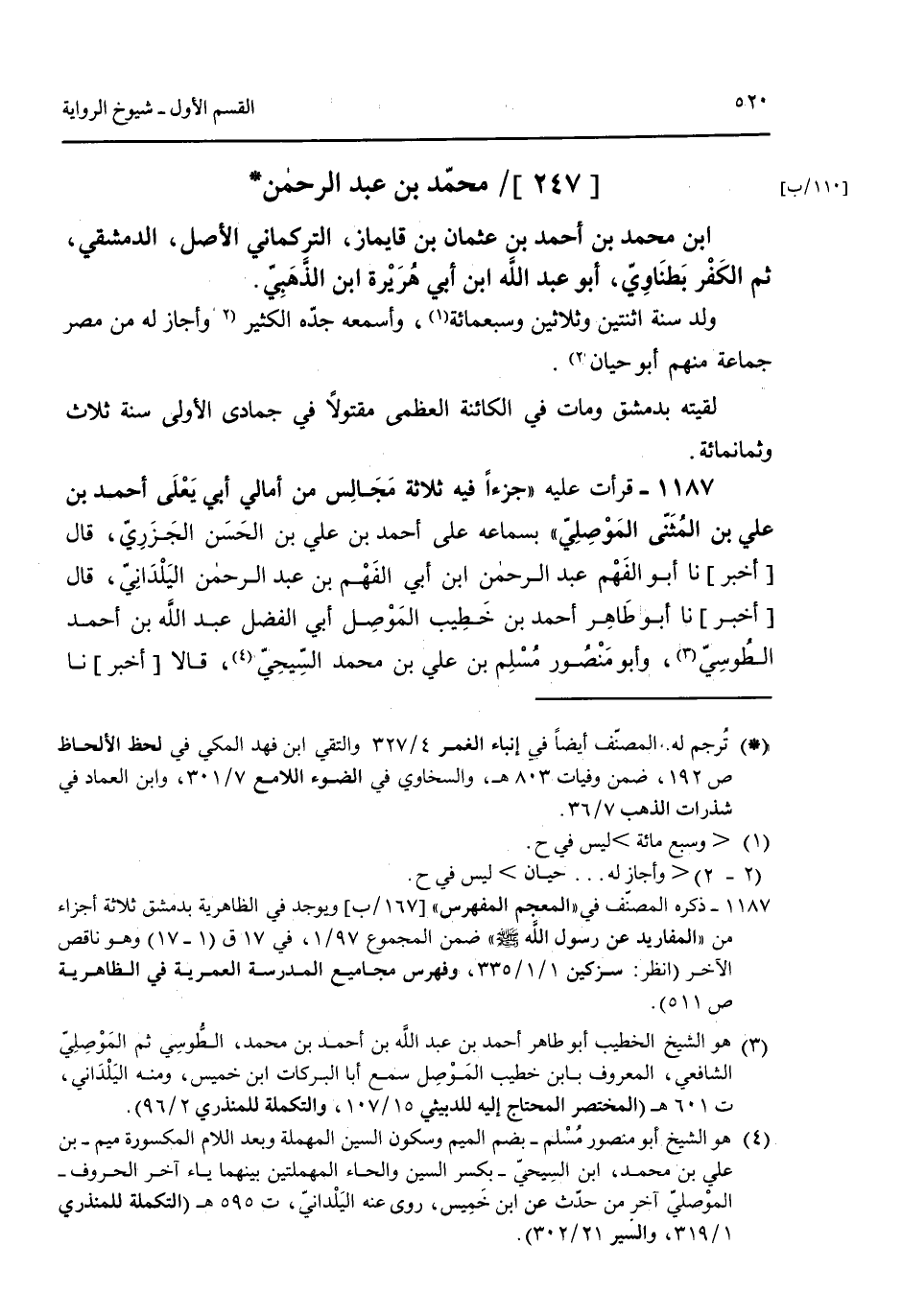 [247] محمد بن عبد الرحمن ابن محمد بن أحمد بن عثمان بن قايماز التركماني الأصل الدمشقي ثم الكفر بطناوي أبو عبد الله ابن أبي هريرة ابن الذهبي.