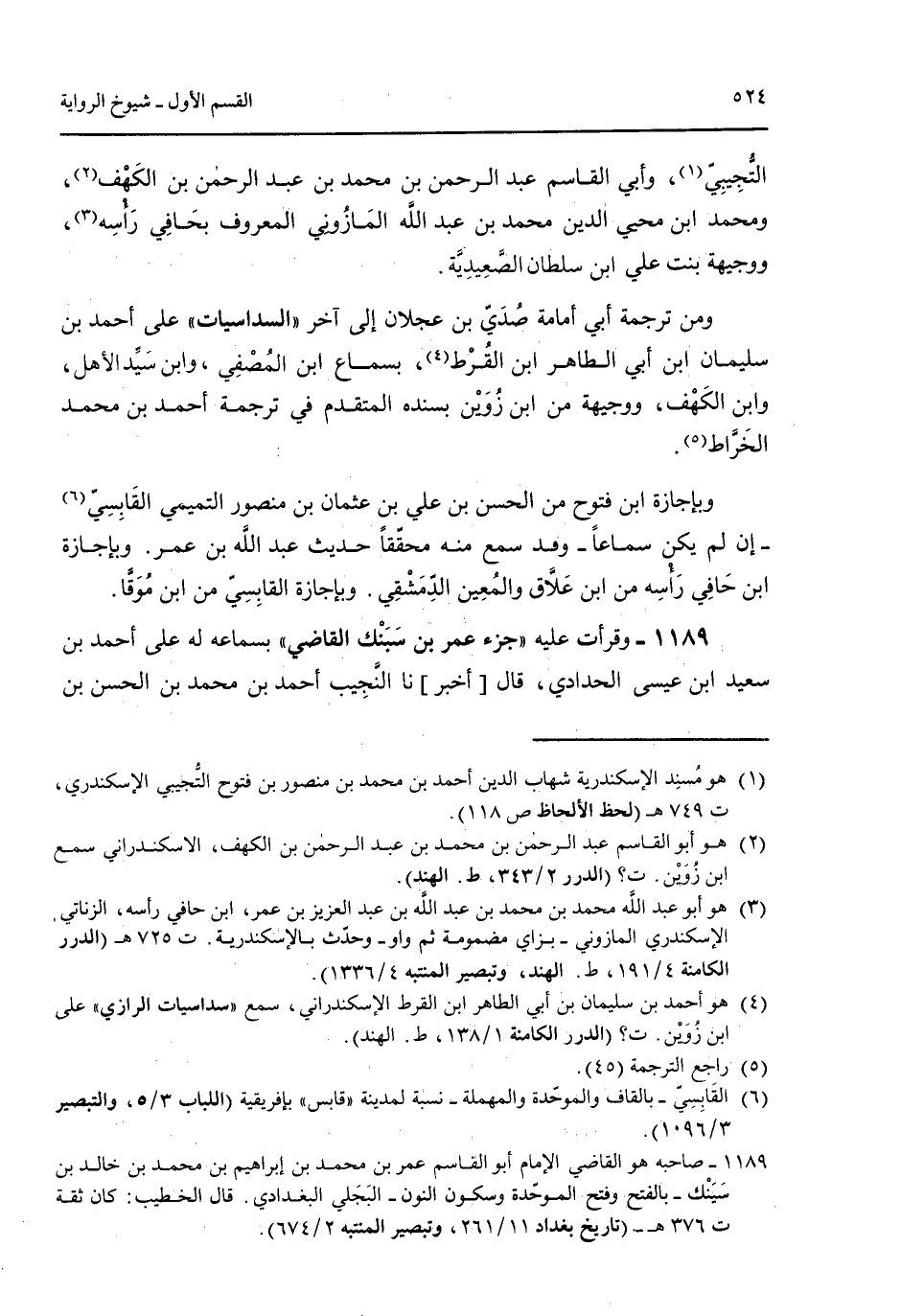 التجيبي وأبي القاسم عبد الرحمن بن محمد بن عبد الرحمن بن الكهف ومحمد بن محي الدين محمد بن عبد الله المازوني المعروف بحافي رأسه ووجيهة بنت علي ابن سلطان الصعيدية. ومن ترجمة أبي أمامة صُدي بن عجلان إلى آخر "السداسيات" على احمد بن سليمان ابن أبي الطاهر ابن القثرط بسماع ابن المصفي وابن سيد الأهل وابن الكعف ووجيهة من ابن زوين بسنده المتقدم في ترجمة أحمد بن محمد الخراط. وبإجازة ابن فتوح من الحسن بن علي بن عثمان بن منصور التميمي القابسي -إن لم يكن سماعاً- ووقد سمع منه محققاً حديث عبد الله بن عمر. وبإجازة ابن حافي رأسه من ابن علاق والمعين الدمشقي وبإجازة القابسي من ابن مُوقا. 1189 - وقرأت عليه "جزء عمر بن سبنك القاضي" بسماعه له على أحمد بن سعيد ابن عيسى الحداد قال [أخبر] نا النجيب أحمد بن محمد بن الحسن بن