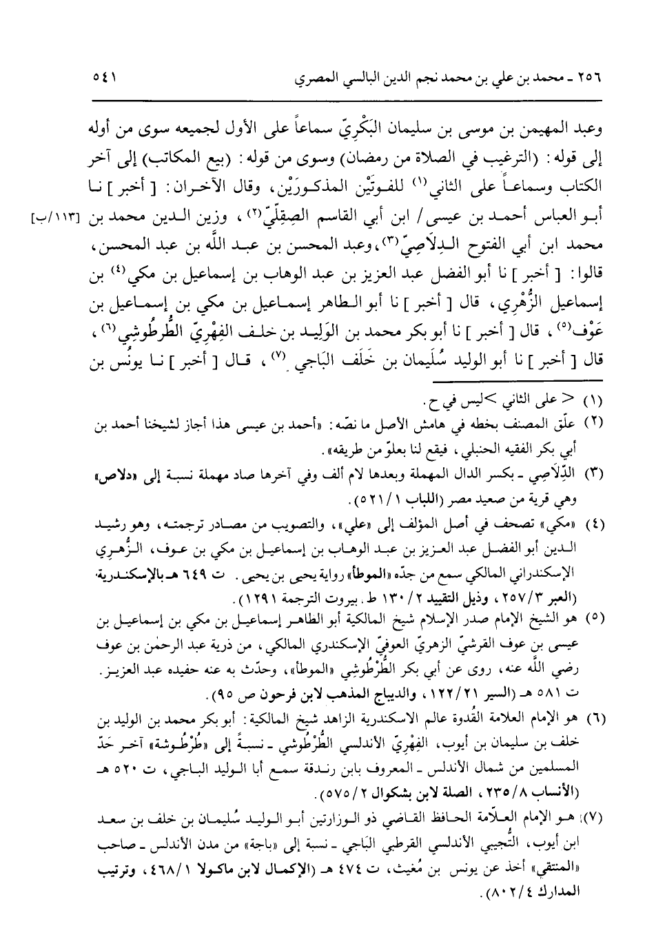 وعبد المهيمن بن موسى بن سليمان البكري سماعاً على الأول لجميعه سوى من أوله إلى قوله: (الترغيب في الصلاة من رمضان) وسى من قوله: (بيع المكاتب) إلى آخر الكتاب وسماعاً على الثاني للفوتين المذكورين وقال الآخران: [أخبر] نا أبو العباس أحمد بن عيسى ابن أبي القاسم الصقلي وزين الدين محمد بن محمد ابن أبي الفتوح الدلاصي وعبد المحسن بن عبد الله بن عبد المحسن قالوا: [أخبر] نا أبو الفضل عبد العزيز بن عبد الوهاب بن إسماعيل بن مكي بن إسماعيل بن عوف قال [أخبر] نا أبو بكر محمد بن الوليد بن خلف الهري الطرطوشي قال [أخبر] نا أبو الوليد سليمان بن خلف الباجي قال [أخبر] نا يونس بن