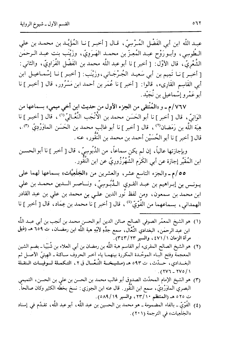 عبد الله بن أبي الفضل المرسي قال [أخبر] نا المؤيد بن محمد بن علي الطوسي وأبو روح عبد المعز بن محمد الهروي وزينب بنت عبد الرحمن الشعري قال الأول [أخبر] نا أبو عبد الله محمد بن الفضل الفراوي والثاني: [أخبر] نا تميم بن أبي سعيد الجُرجاني وزينب: [أخبر] نا إسماعيل ابن أبي القاسم القارئ قالوا: [أخبر] نا عمر بن أحمد ابن مسرور قال [أخبر] نا أبو عمرو إسماعيل بن نُجيد. 767/م-و "المنتقى من الجزء الأول من حديث ابن أخي ميمي" بسماعها من الواني قال [أخبر] نا أبو الحسن محمد بن الأنجب النعالي قال [أخبر] نا هبة الله بن رمضان قال [أخبر] نا أبو غالب محمد بن الحسن المارودي قال [أخبر] نا أبو الحسين أحمد بن محمد بن النقور عنه. وبإجازتها عالياً إن لم يكن سماعاً من الدبوسي قال [أخبر] نا أبو الحسن ابن المقير إجازة عن أبي الكرم الشهرزوري عن ابن النقور. 55/م- والجزء التاسع عشر والعشرين من "الخلعيات" بسماعها لهما على يونس بن إبراهيم بن عبد القوي الدبوسي وناصر الدين محمد بن علي ابن محمد بن سمعون ومن لفظ نور الدين علي بن محمد بن علي بن عبد القادر الهمداني بسماعهما من الفوي قال [أخبر] نا محمد بن عماد قال [أخبر] نا