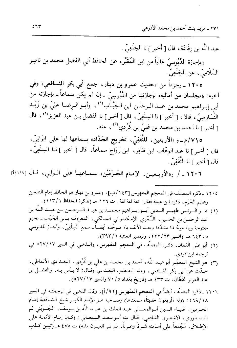 عبد الله بن رفاعة قال [أخبر] نا الخلعي. وبإجازة الدبوسي عالياً من ابن المُقير عن الحافظ أبي الفضل محمد بن ناصر السلامي عن الخلعي. 1205 - وجزءاً من "حديث عمرو بن دينار جمع أبي بكر الشافعي" وفي آخره: "مجلسان من أماليه" بإجازتها من الدوسي -إن لم يكن سماعاً- بإجازته من أبي إبراهيم محمد بن عبد الرحمن ابن الجباب وأبو الرضا علي بن زيد التسارسي قالا: [أخبر] نا قال [أخبر] نا الفضل بن عبد العزيز قال [أخبر] نا أحمد بن محمد بن علي بن مُردي عنه. 715/م- و "الأربعين للثقفي تخريج الحداد" بسماعها لها على الواني قال [أخبر] نا عبد الوهاب ابن ظافر ابن رواج سماعاً قال [أخبر] نا السلفي قال [أخبر] نا الثقفي. 1206 - و "الأربعين لإمام الحرمين" بسماعها على الواني قال