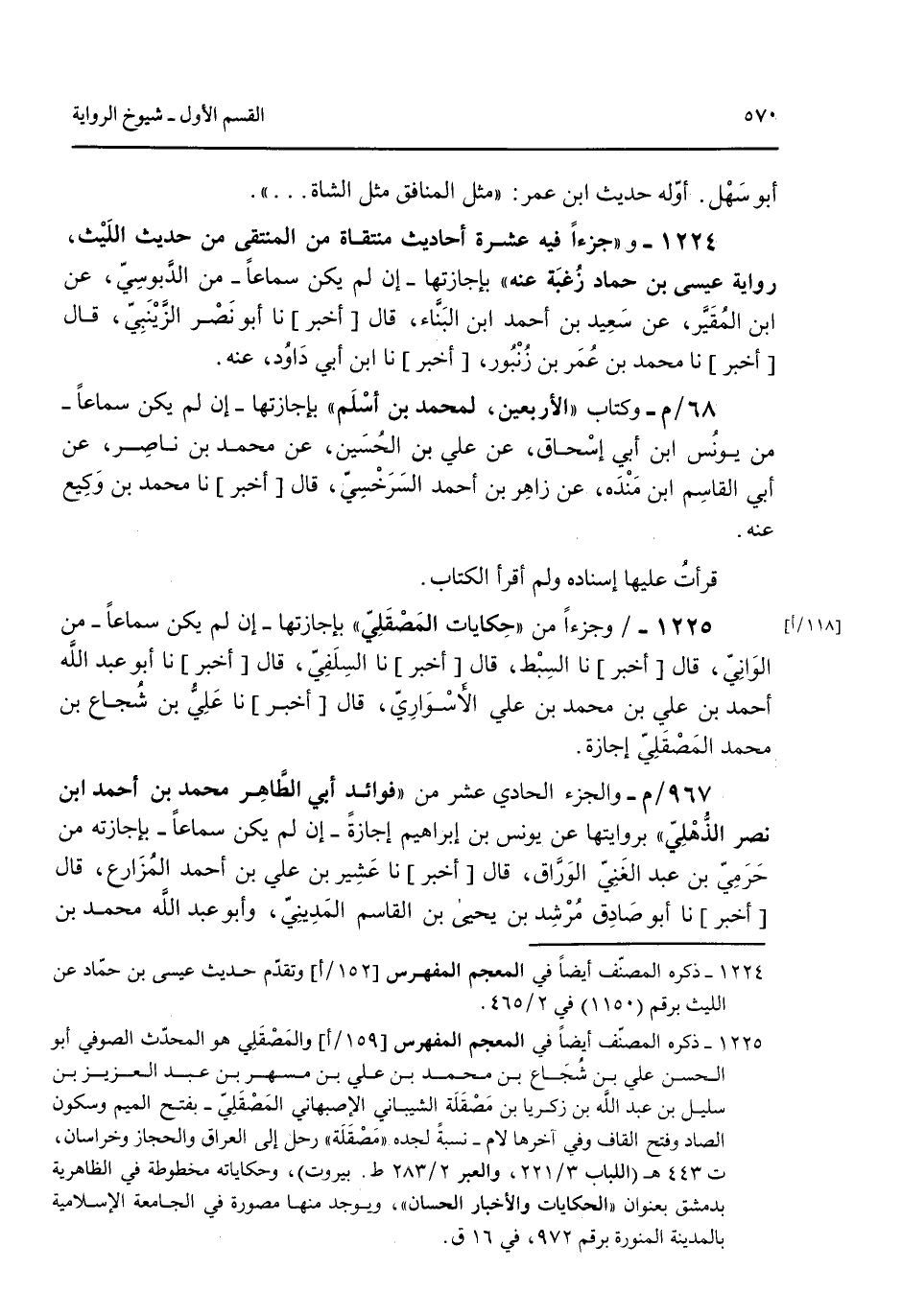 أبو سهل. أوله حديث ابن عمر "مثل المنافق مثل الشاة ... ". 1224 - و "جزءاً فيه عشرة احاديث منتقاه من المنتقى من حديث الليث رواية عيسى بن حماد زُغبة عنه" بإجازتها -إن لم يكن سماعاً- من الدبوسي عن ابن المقير عن سعيد بن أحمد ابن البناء قال [أخبر] نا أبو نصر الزينبي قال [أخبر] نا محمد بن عُمر بن زنُبور [أخبر] نا ابن أبي داود عنه. 68/م- وكتاب "الأربعين لمحمد بن أسلم" بإجازتها -إن لم يكن سماعاً من يونس ابن أبي إسحاق عن علي بن الحسين عن محمد بن ناصر عن أبي القاسم ابن منده عن زاهر بن أحمد السرخسي قال [أخبر] نا محمد بن وكيع عنه. قرأت عليها إسناده ولم أقرأ الكتاب. 1225 - وجزءاً من "حكايات المصقلي" بإجازتها -إن لم يكن سماعاً- من الواني قال [أخبر] نا السبط قال [أخبر] نا السلفي قال [أخبر] نا أبو عبد الله أحمد بن علي بن محمد بن علي الأسواري قال [أخبر] نا علي بن شجاع بن محمد المصقلي إجازة. 967/م- والجزء الحادي عشر من "فوائد أبي الطاهر محمد بن أحمد ابن نصر الذهلي" بروايتها عن يونس بن إبراهيم إجازة -إن لم يكن سماعاً- بإجازته من حرمي بن عبد الغني الوارق قال [أخبر] نا عشير بن علي بن أحمد المزارع قال [أخبر] نا أبو صادق مرشد بن يحيى بن القاسم المديني وأبو عبد الله محمد بن