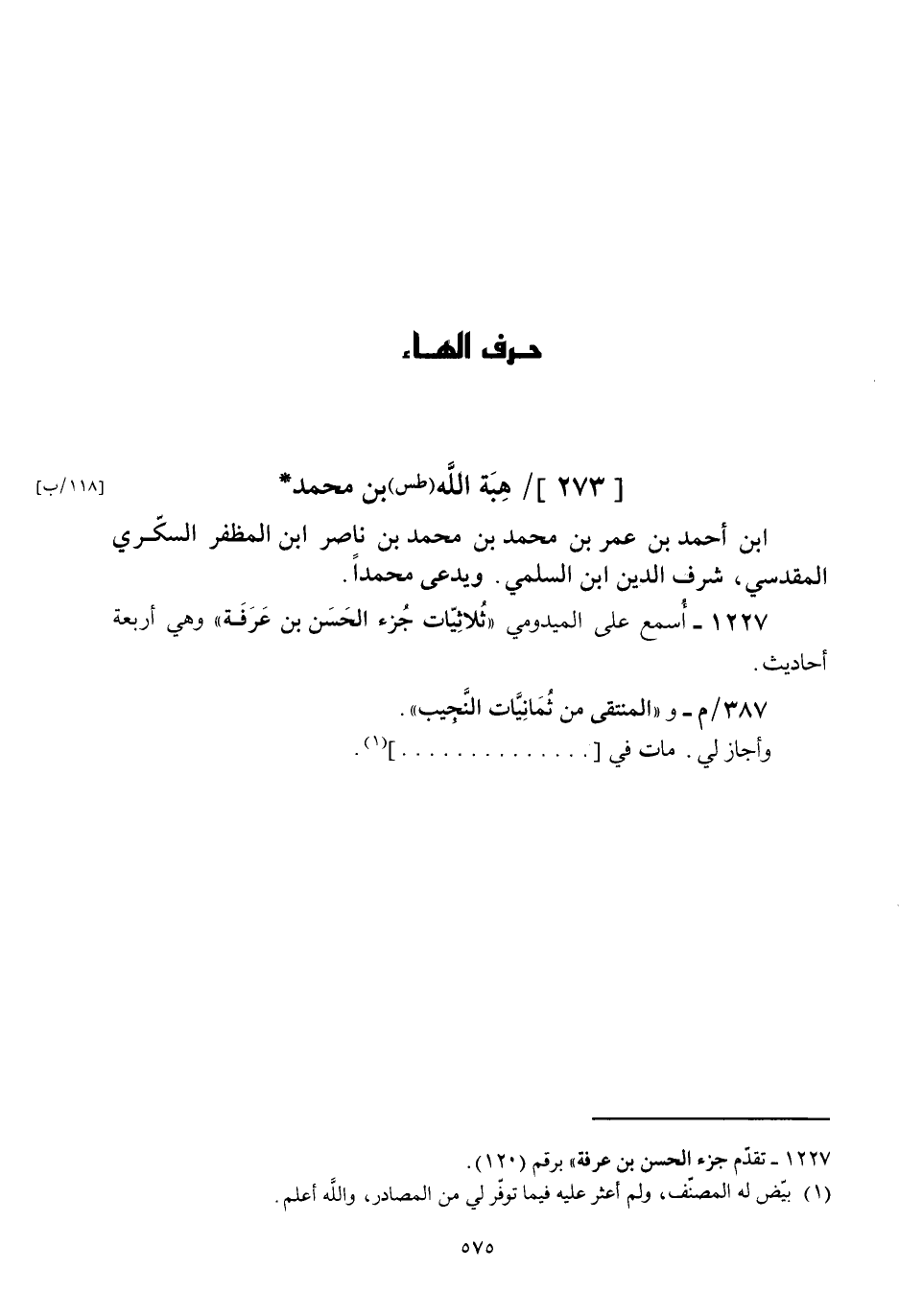 [273] هبة الله (طس) بن محمد ابن أحمد بن عمر بن محمد بن محمد بن ناصر ابن المظفر السكري المقدسي شرف الدين ابن السلمي ويدعى محمداً.