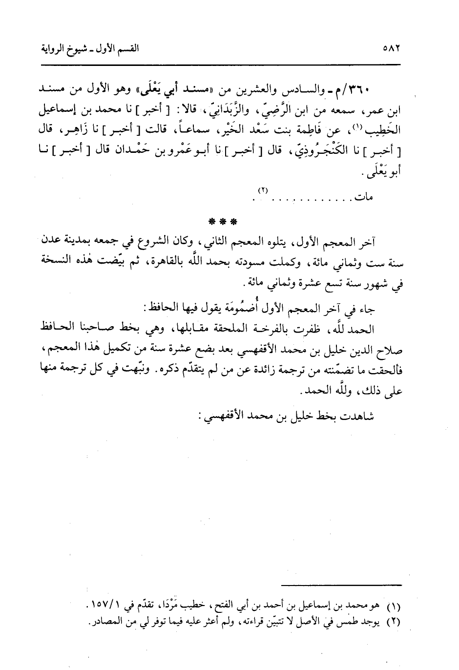 360/م- السادس والعشرين من "مسند أبي يعلي " وهو الأول من مسند ابن عم سمعه من ابن الرضي والزبداني قالا [أخبر] نا محمد بن إسماعيل الخطيب عن فاطمة بنت سعد الخير سماعاً قالت [أخبر] نا زاهر قاى. [أخبر] نا الكنجروذي قال [أخبر] نا أبو عمرو بن حمدان قال [أخبر] نا أبو يعلى. مات ....... آخر المعجم الأول يتلوه المعجم الثاني وكان الشروع في جمعة بمدينة عدن سنة ست وثماني مائة وكملت مسودته بحمد الله بالقاهرة ثم بيضت هذه النسخة في شهور سنة تسع عشرة وثماني مائة. جاى فى آخر المعجم الأول أضمونة يقول فيها الحافظ: ظفرت بالفرخة الملحقة مقابلا وهي بخط صاحبنا الحافظ صلاح الدين الخليل بن محمد الأقفهسي بعد بضع عشرة سنة من تكميل هذا المعجم فألحقت ما تضمنته من ترجمة زائدة عن من لم يتقدم ذكره. ونبهت في كل ترجمة على ذلك ولله الحمد. شاهدت بخط خليل بن محمد الأقفهسي:
