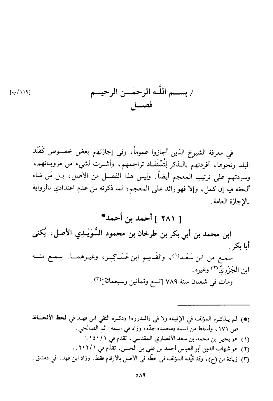 بسم الله الرحمن الرحيم. فضل فى معرفة الشيوخ الذين أجازوا عموماً وفي إجازتهم بعض خصوص كقيد البلد ونحوها أفردتم بالذكر لتستفاد تراجمهم وأشرت لشيء من مروياتهم وسردتهم على ترتيب المعجم أيضاً. وليس هذا الفصل من الأصل بل ما شاء ألحقه فيه إن أكمل وإلا فهو زائد على المعجم لما ذكرته من عدم اعتدادي بالرواية بالإجازة العامة.