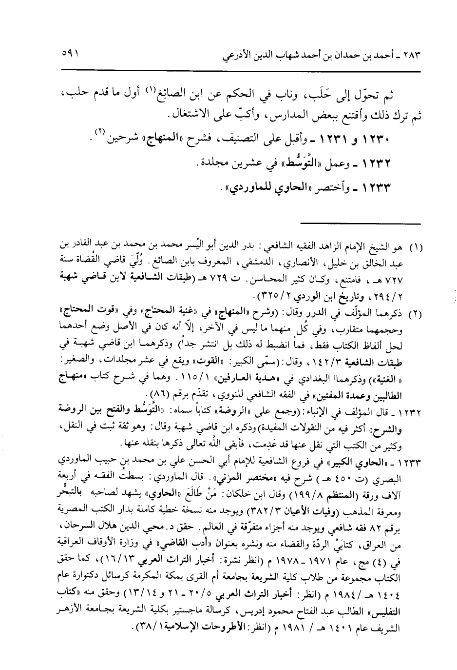 ثم تحول إلى حلب وناب في الحكم عن ابن الصائغ أول ما قدم حلب ثم ترك ذل واقتنع ببعض المدارس وأكب على الاشتغال. 1230 و 1231 - وأقبل على التصنيف فشرح "المنهاج" شرحين. 1232 - وعمل "التوسط" في عشرين مجلد. 1233 - واختصر "الحاوي للماوردي".