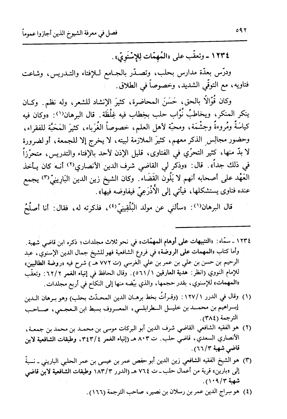 1234 - وتعقب على "المهمات للإسنوي". ودرس بعدة مدارس بحل وتصدر بالجامع للإفتاء والتدريس وشاعت فتاويه مع التوقي الشديد وخصوصاً في الطلاق. وكان قوالاً بالحق حسن المحاضرة كثير الإنشاد للشعر وله نظم. وكان ينكر المنكر ويخاطب نواب حلب بخطاب فيه غلظة. قال البرهان: "وكان فيه كياسة ومروءة وحشمة ومحبة لأهل العلم خصوصاً الغرباء كثير المحبة للفقراء وحضور مجالس الذكر معهم كثير المزمة لبيته لا يخرج إلا للجمعة أو لضرورة لا بد منها كثير التحري في الفتاوي قليل الإذن لأحد بلإقتاء والتدريس متحرزاً فى ذلك جداً". قال: "وذكر لي القاضي شرف الدين الانصاري أنه كان يأخذ العهد على أصحابه أنهم لا يلون القضاء. وكان الشيخ زين الدين الباريني يجمع عنده فتاوى يستكشهل فيأتي إلى الأذرعي فيفاوضه فيها". قال البرهان: "سألني عن مولد البلقيني فذكرته له فقال: أنا أصلُح