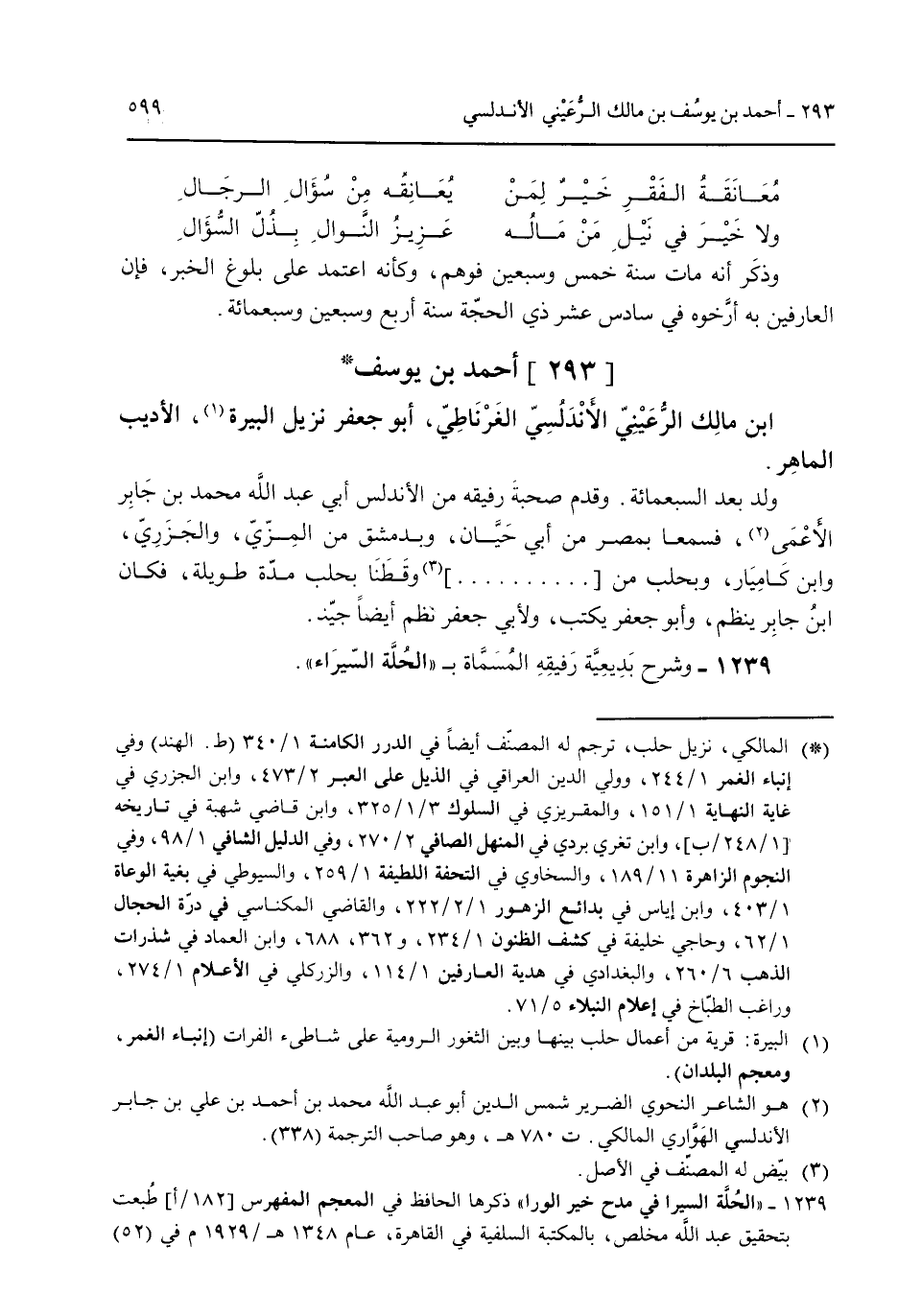 [293] أحمد بن يوسف ابن مالك الرعيني الأندلسي الغرناطي أبو جعفر نزيل البيرة الأديب الماهر ولد بعد السبعمائة وقدم صحبة رفيقة الأندلس أبي عبد الله محمد بن جابر الأعمى فسمعا بمصر من أبي حيان وبدمشق من المزي والجزري وابن كاميار وبحلب من.